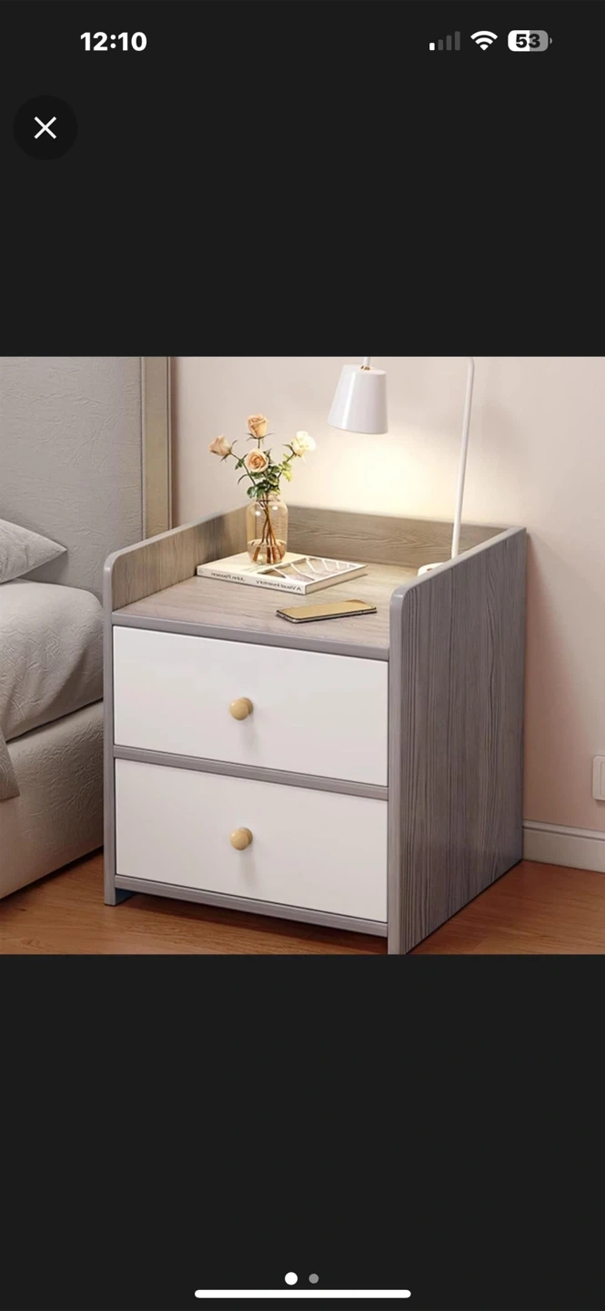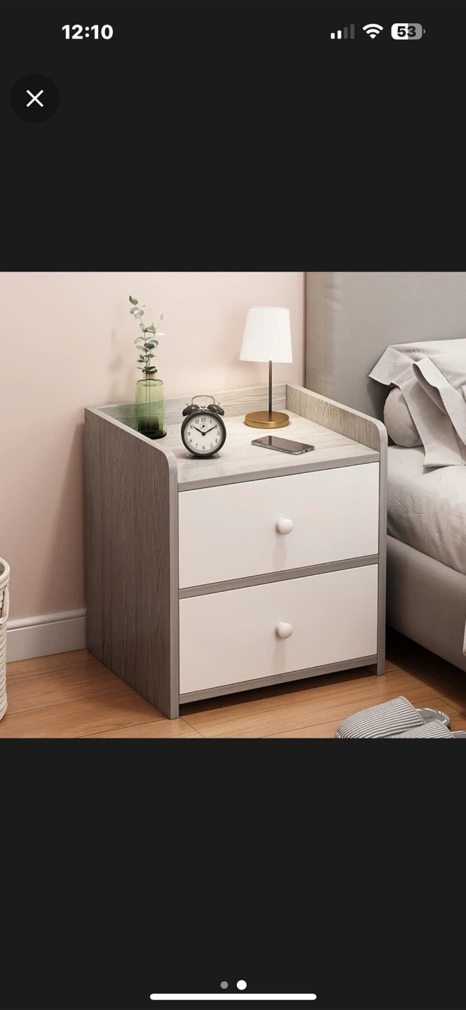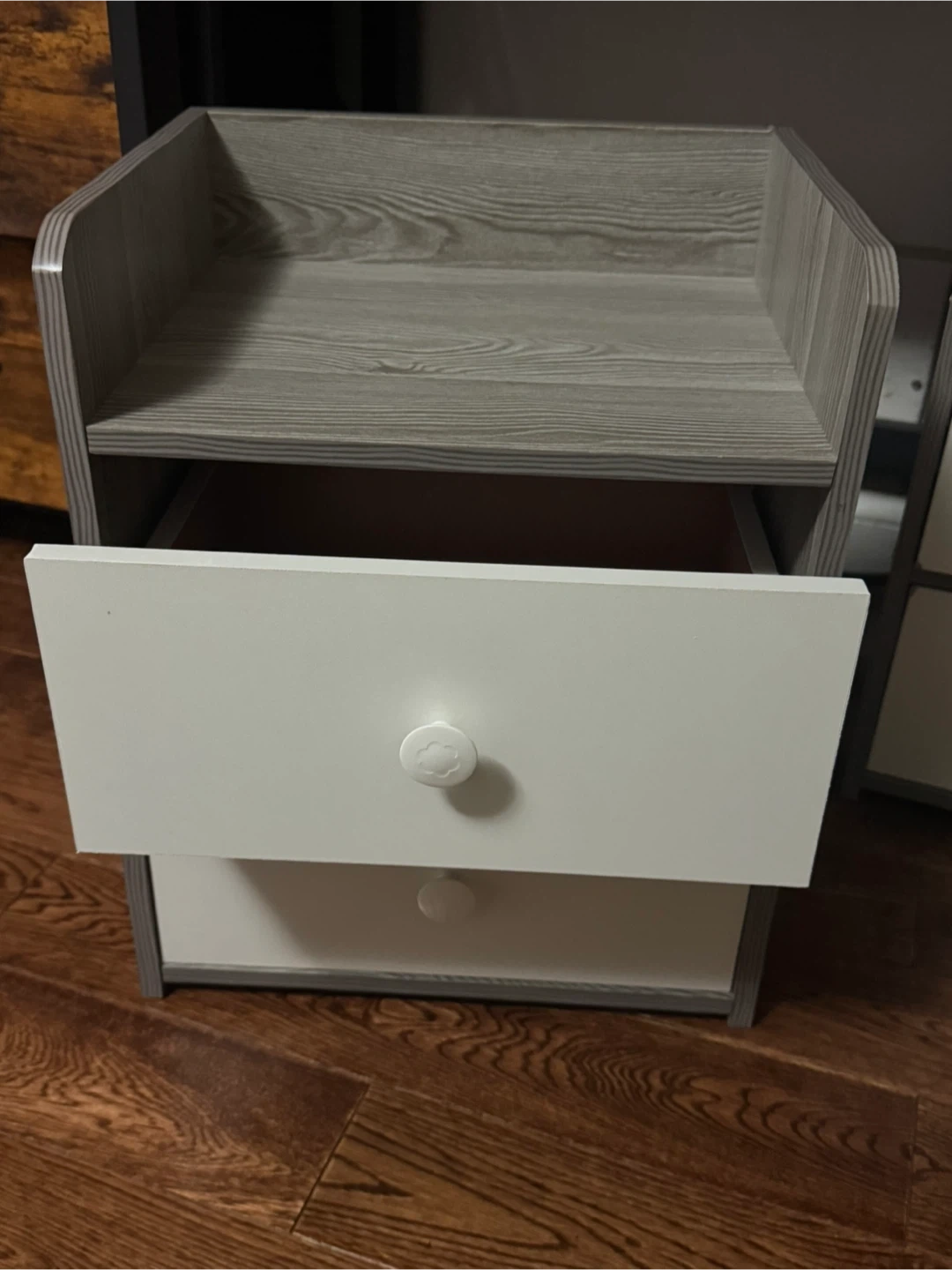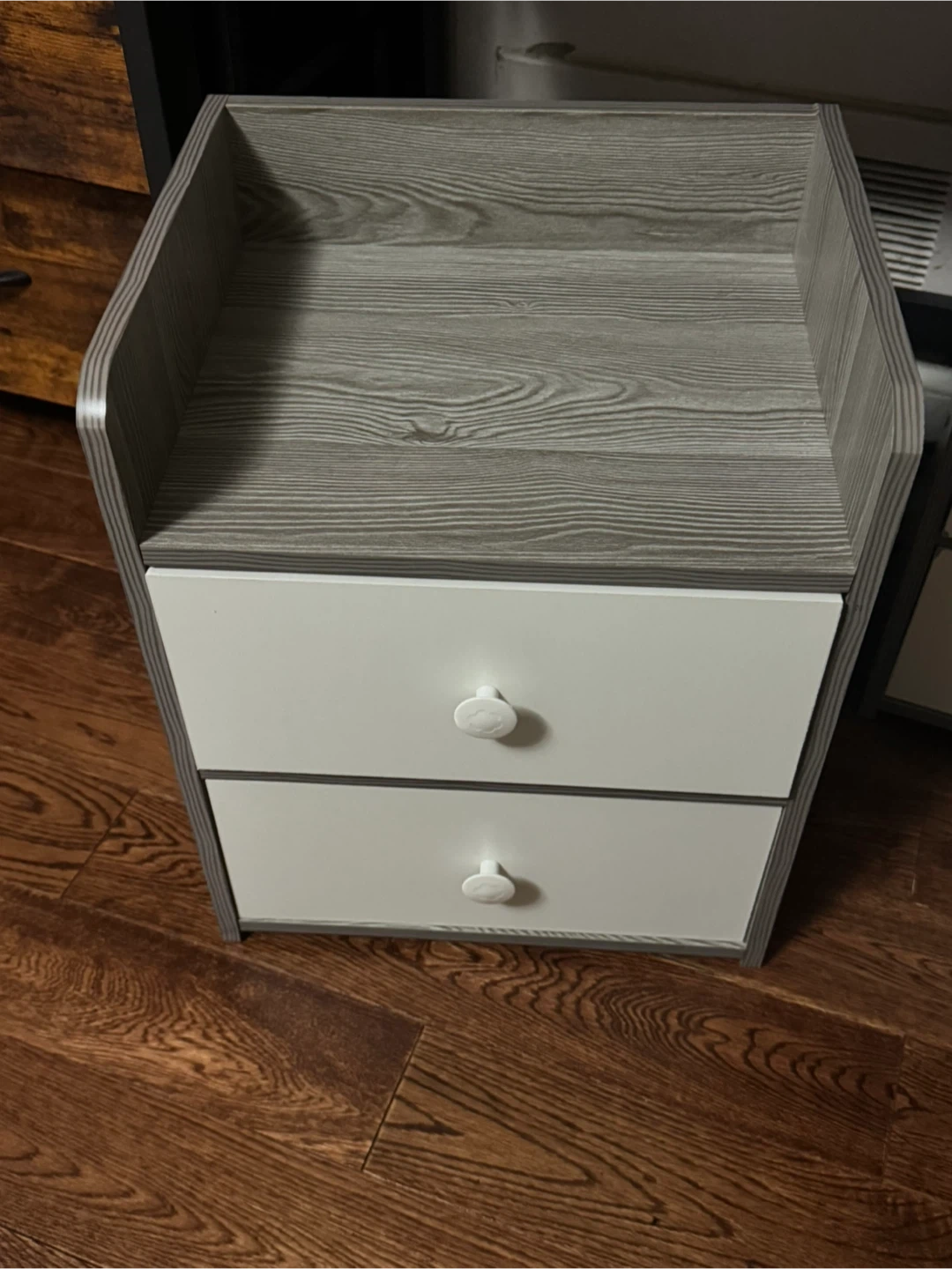 Here's a cute nightstand with two drawers! It's a grey wood-look finish on the top and sides, with white drawers and round knobs. Perfect for adding some storage next to your bed or sofa