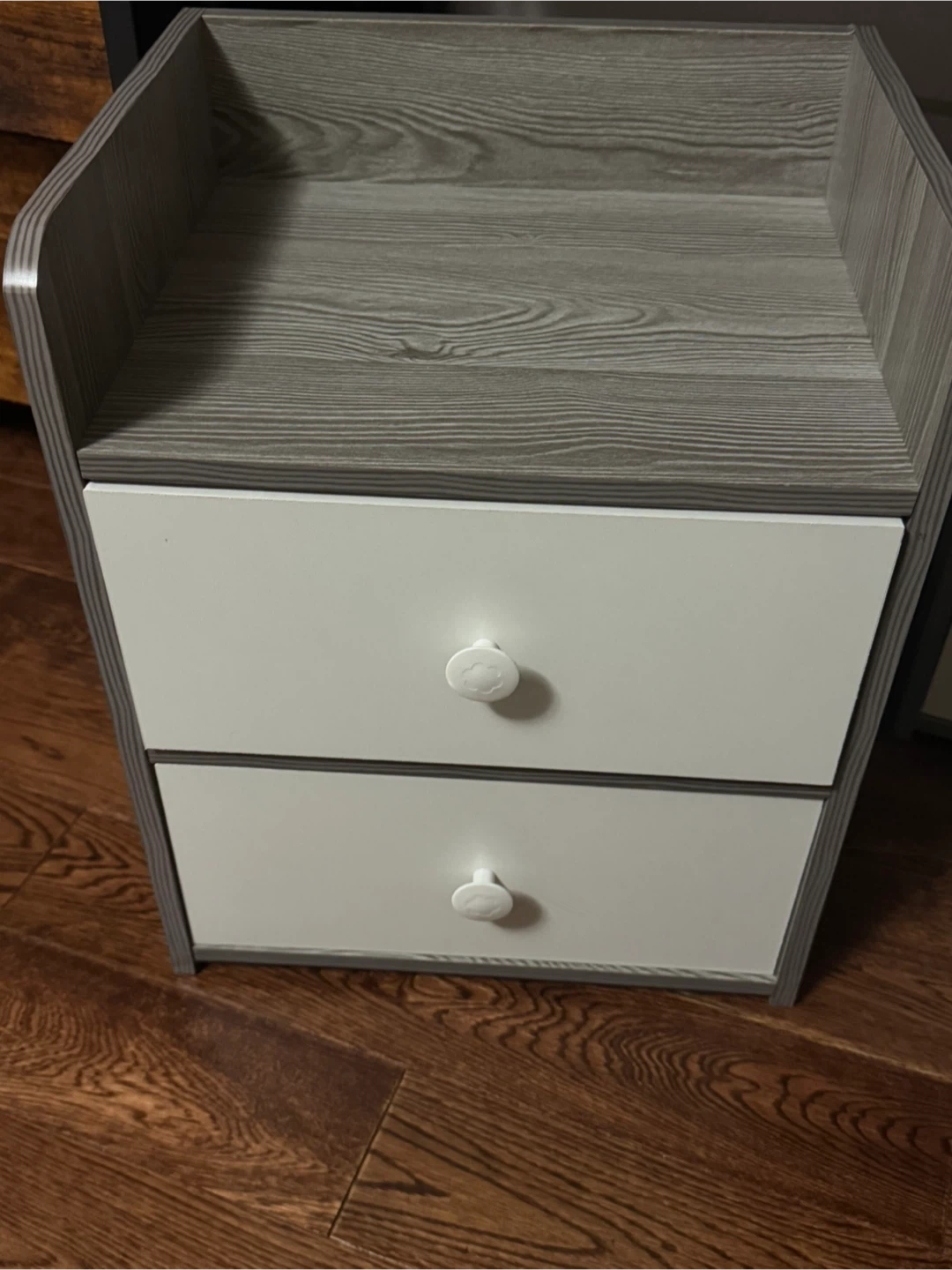 Here's a cute nightstand with two drawers! It's a grey wood-look finish on the top and sides, with white drawers and round knobs. Perfect for adding some storage next to your bed or sofa