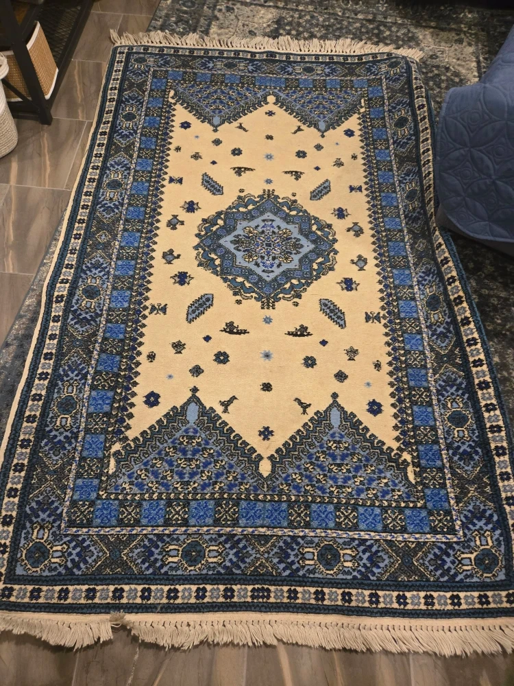 This is a lovely area rug with a cream-coloured centre and a beautiful blue patterned border. It would look great in any room!