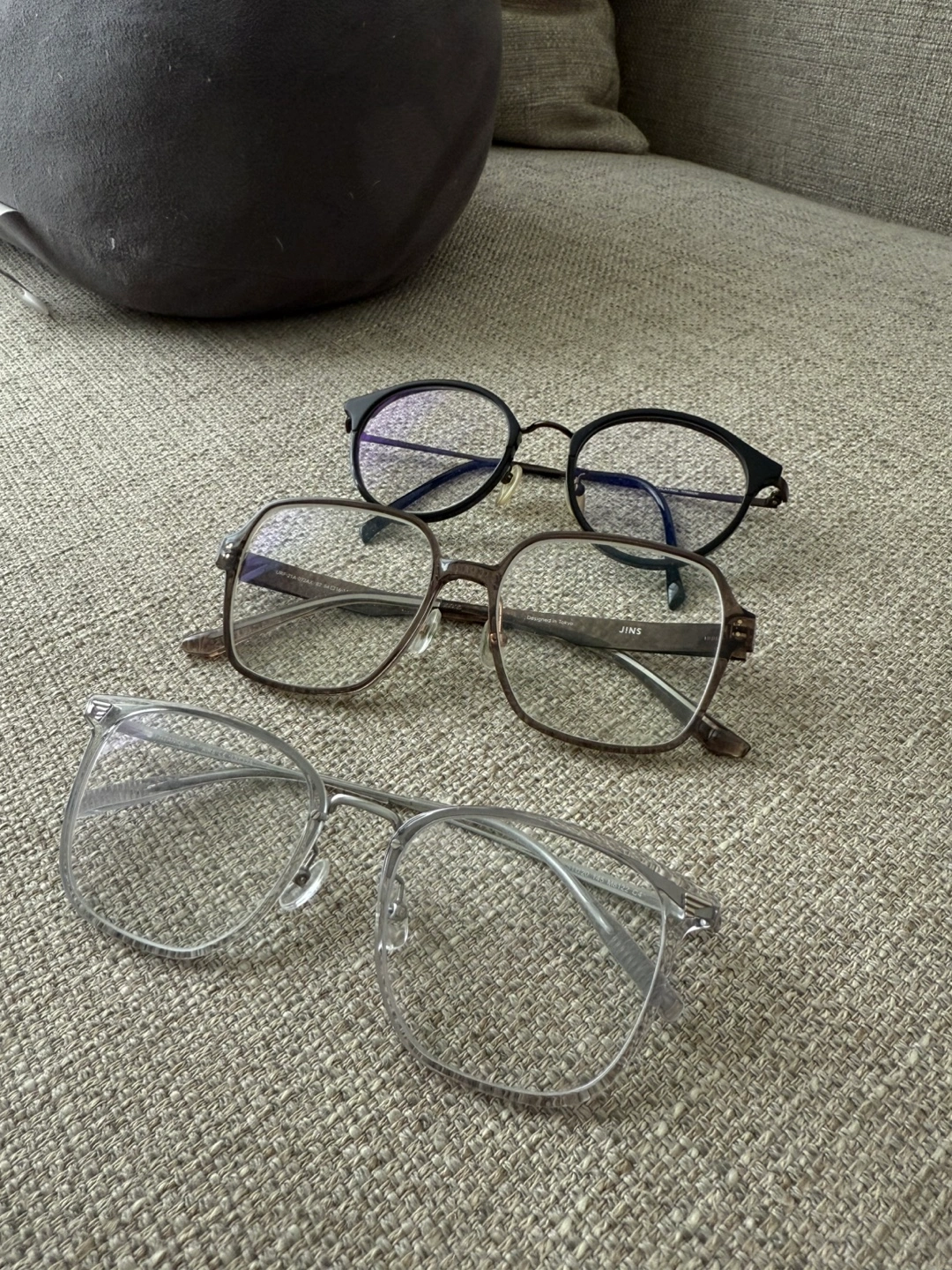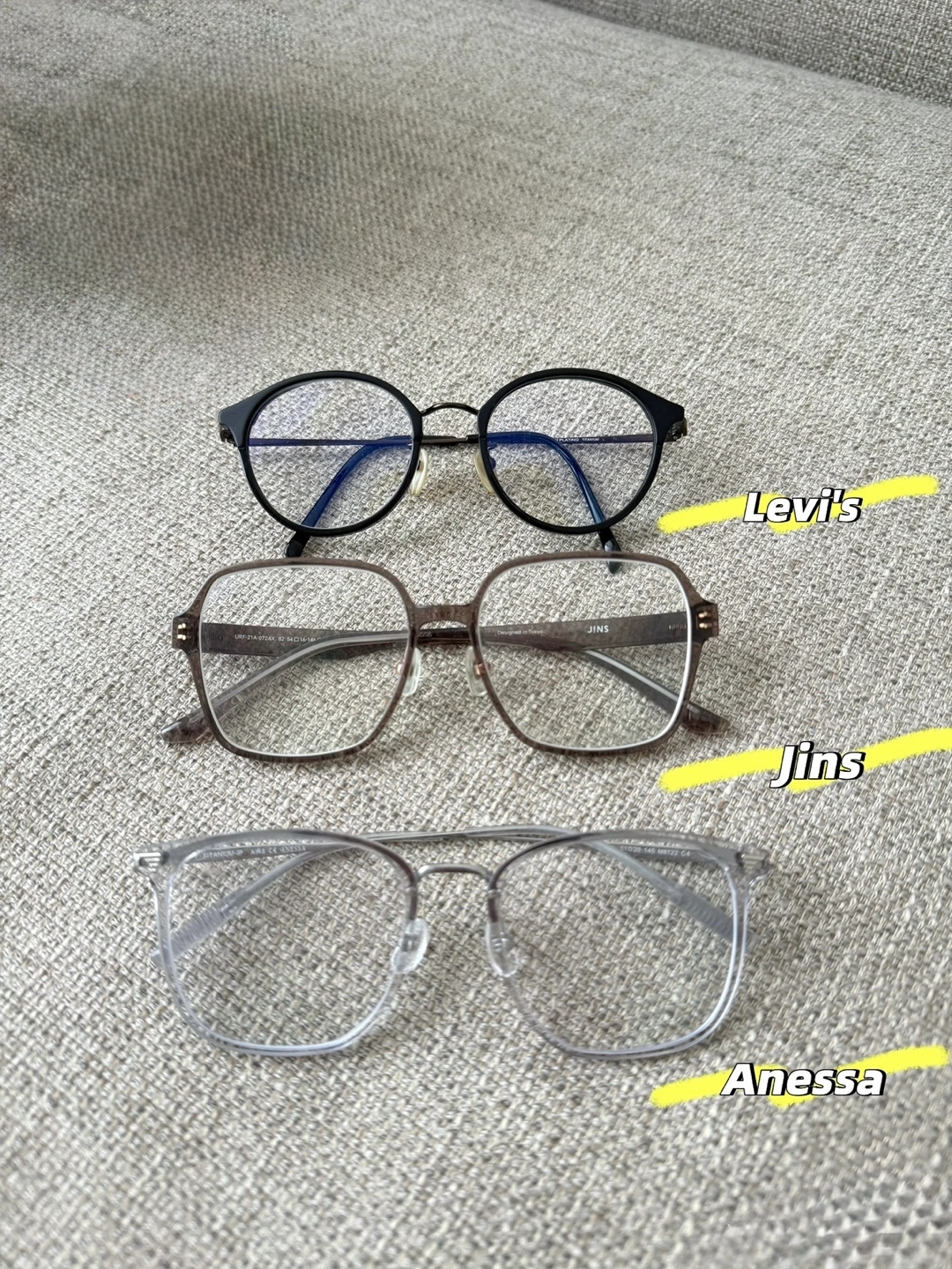 Three pairs of eyeglasses. Various styles and colours. Includes one pair of JINS glasses and one pair of Levi's glasses. One other pair of Anessa glasses.