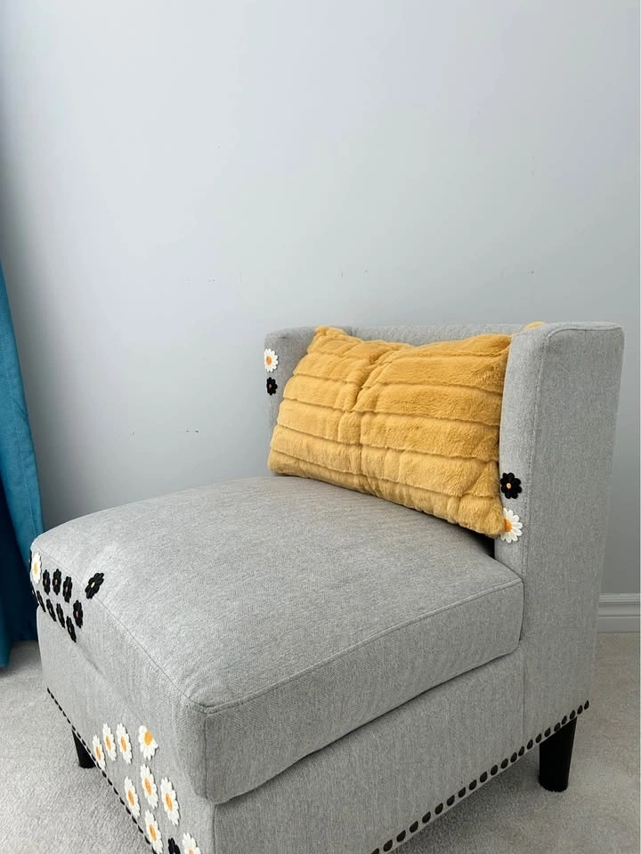 Beautiful custom accent chair with embroidered black and white floral detailing and a soft mustard accent pillow. This one-of-a-kind piece has been professionally cleaned and restored, giving it a fresh new life. Perfect for a reading corner, bedroom, nursery, or living room as a unique statement piece.