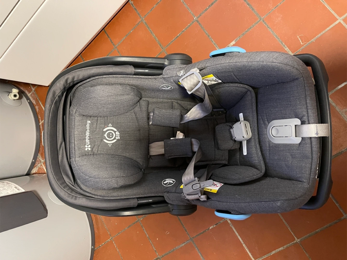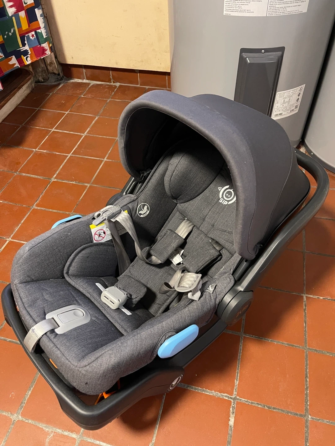 This UPPAbaby MESA infant car seat is a dark grey colour and includes the base. It's designed with SIP (Side Impact Protection) for safety. The fabric is a heathered material.