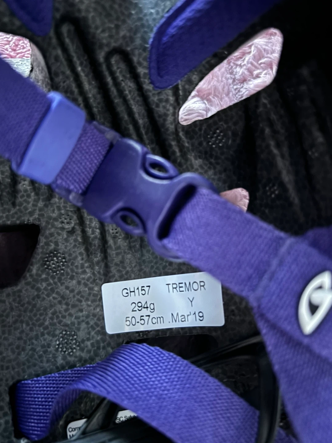This Giro Tremor helmet is designed for youth riders. It features a size of 50-57cm and weighs 294g. Manufacturing date was March 2019. Keeps young cyclists safe on their adventures!