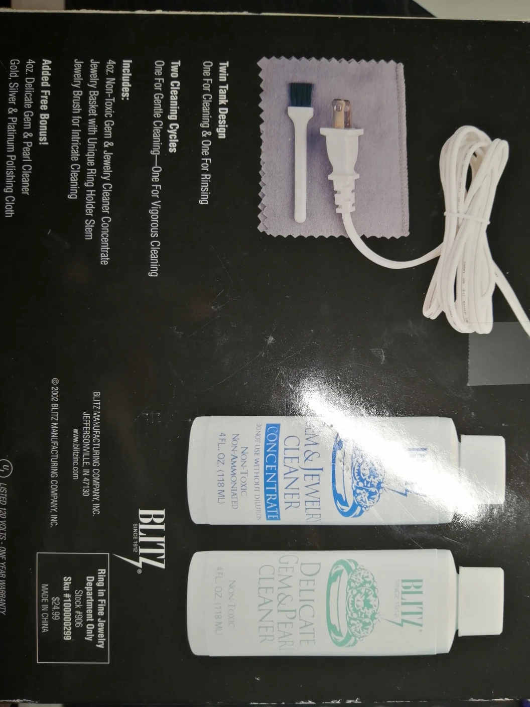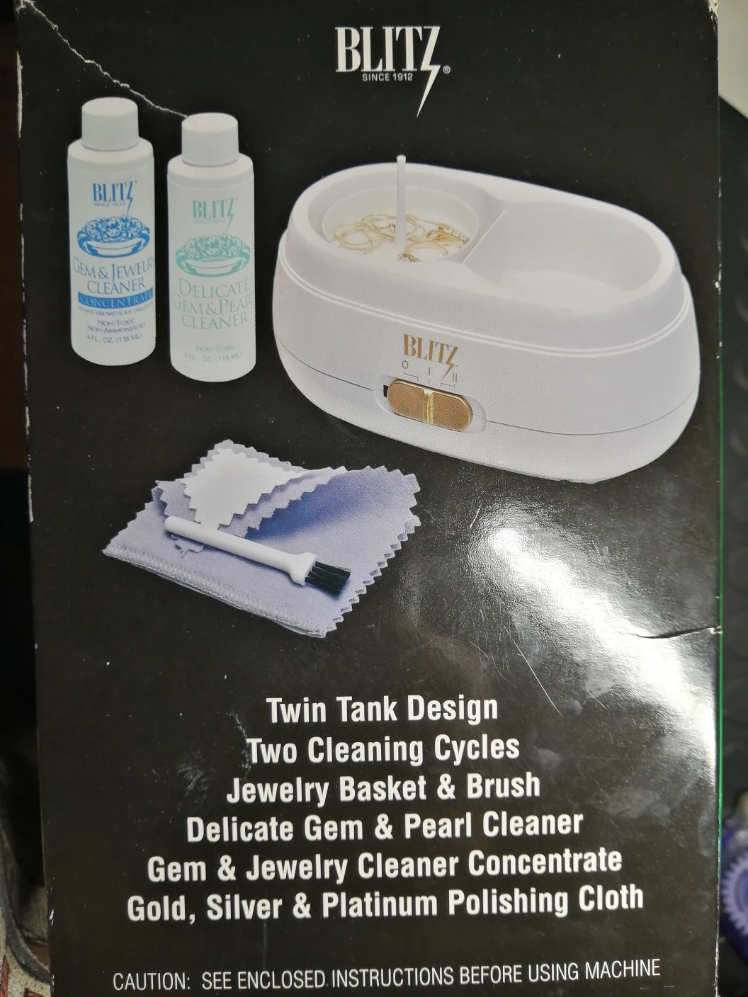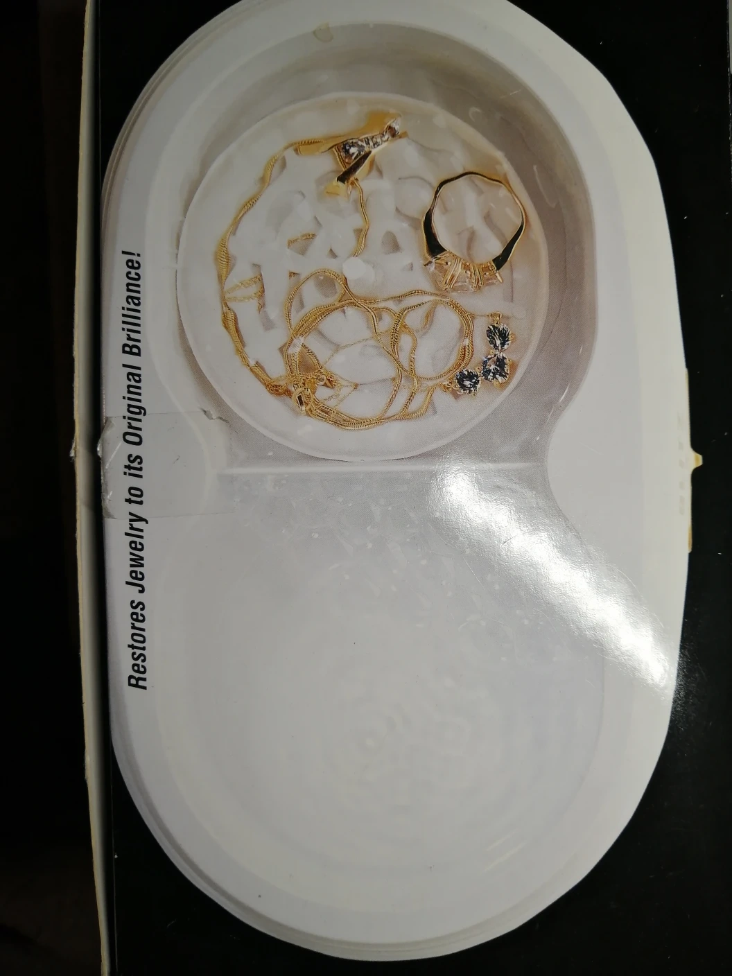 Ultrasonic jewelry cleaner. Features two cleaning cycles, jewelry basket and brush. Includes gem and pearl cleaner concentrate, polishing cloth. Restores jewelry to its original brilliance.