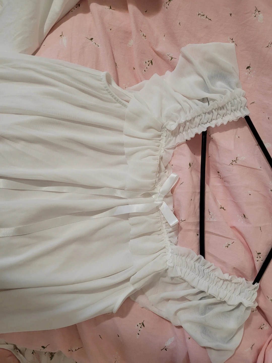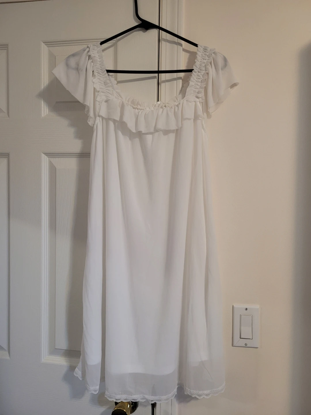 Selling a cute white nightgown! It features a ruffled neckline and short sleeves, perfect for a comfortable night's sleep. The material is soft and flowy, with a ribbon tie at the front. The bottom hem is trimmed with lace.