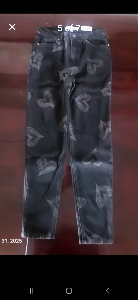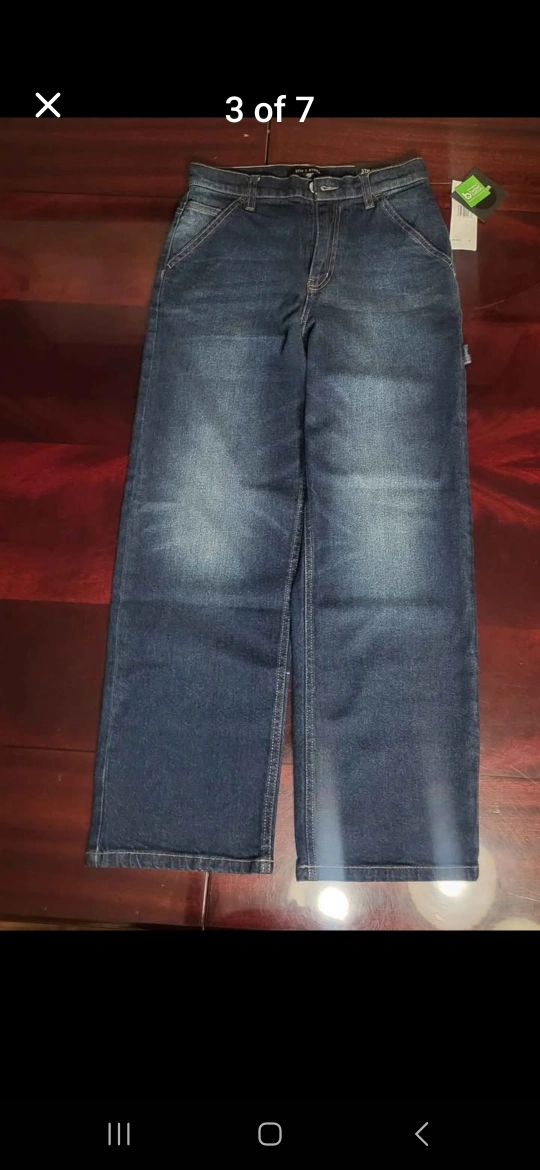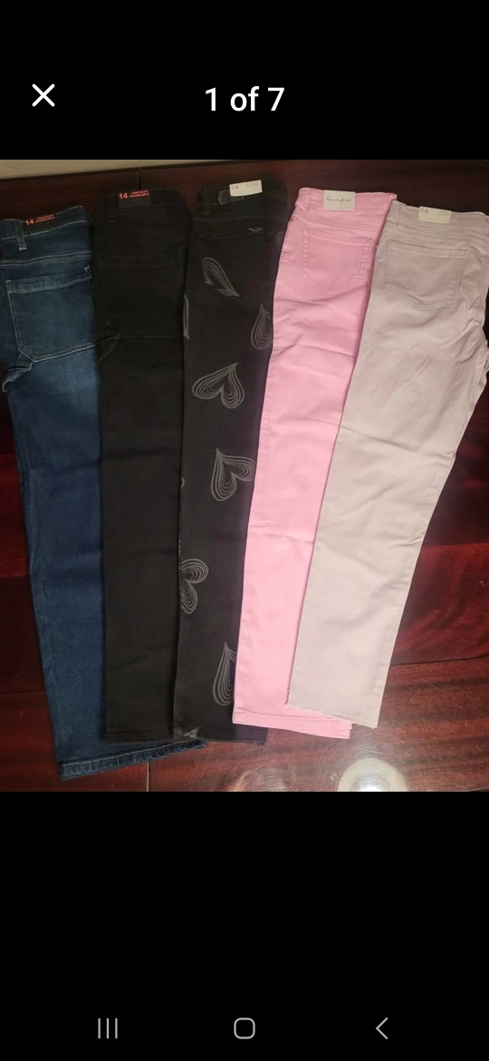 Girls' jeans, various colours and styles. Size 14. Includes dark wash, black with heart print, pink, light mauve, and carpenter style. New with tags.
