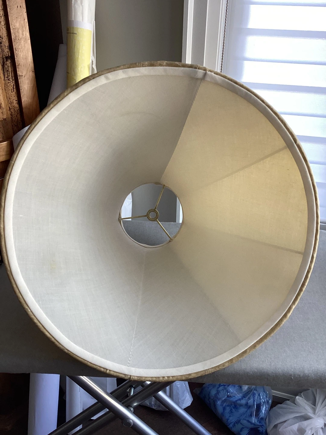 Beige Lampshade, it is easy care vinyl just wipe clean when it gets dusty, some minor staining inside, 5” wide at top, 15” wide at bottom, $10 or best offer.