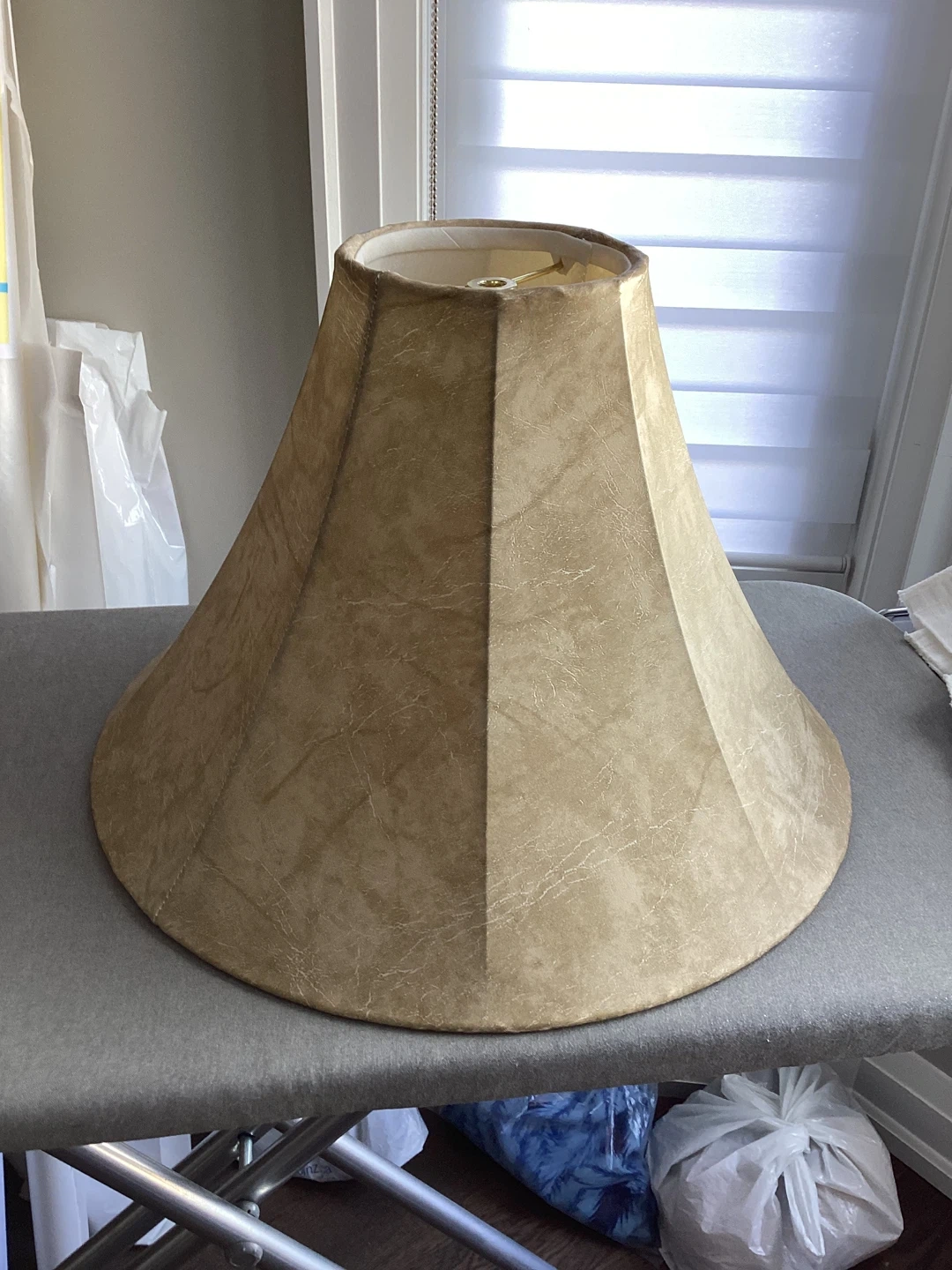 Beige Lampshade, it is easy care vinyl just wipe clean when it gets dusty, some minor staining inside, 5” wide at top, 15” wide at bottom, $10 or best offer.