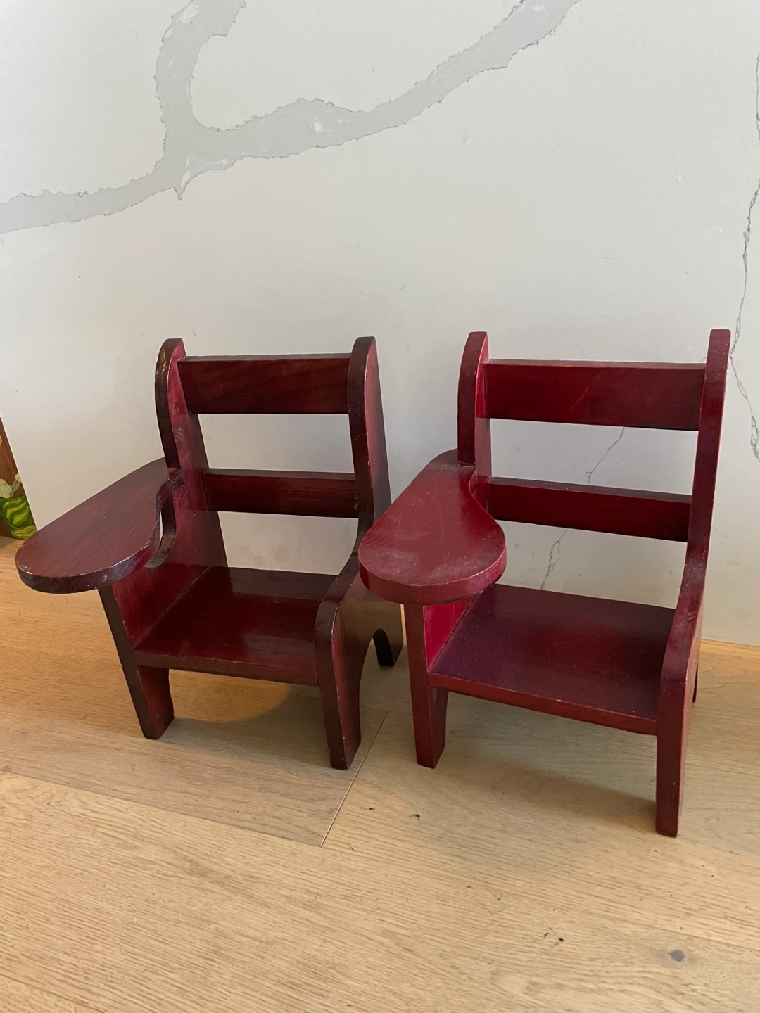 Selling two cute vintage-style doll chairs! They're a dark red colour and perfect for a playroom or kids' room. They add a touch of charm and are in good condition for their age