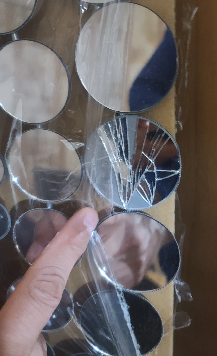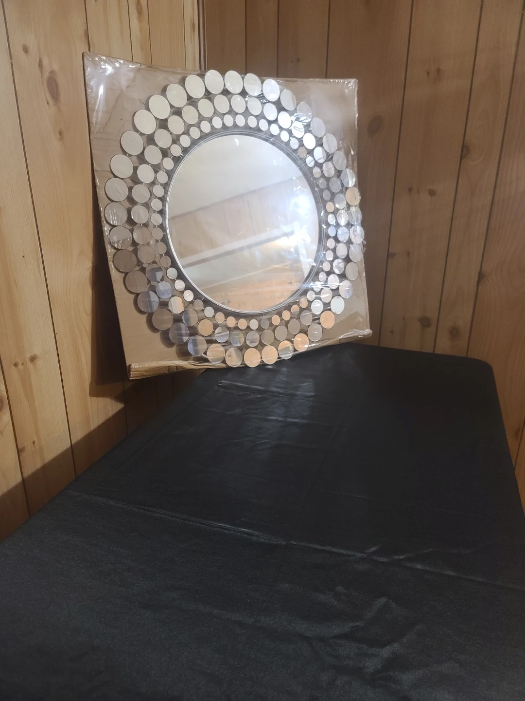 This decorative mirror has a unique circular design with many small mirrored accents around the edge. It's suitable for adding a touch of style to any room. Some of the smaller mirrored pieces may show minor chips or cracks.