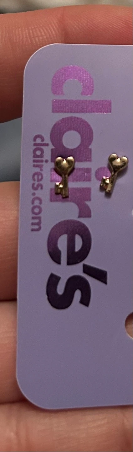 These are cute gold tone stud earrings from Claire's. They're shaped like little keys. Perfect for adding a whimsical touch to any outfit!