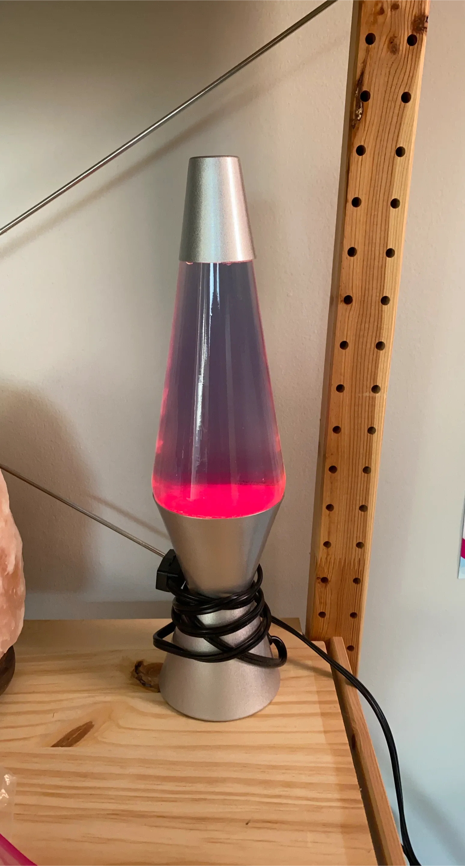 Add a touch of retro fun to your space with this classic lava lamp! The silver base and top complement the mesmerizing motion of the purple and red lava inside. It's in great condition and ready to bring some groovy vibes to your home