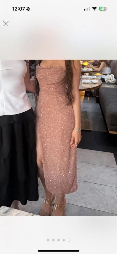 Perfect fitting beaded midi dress in the prettiest colour. Out of stock on oh Polly website! Oh Polly champagne rose pink sequin midi dress Size 2, only worn once for a birthday in perfect condition. Inner lining is very comfortable and the dress itself has a good weight to it and is very well made.