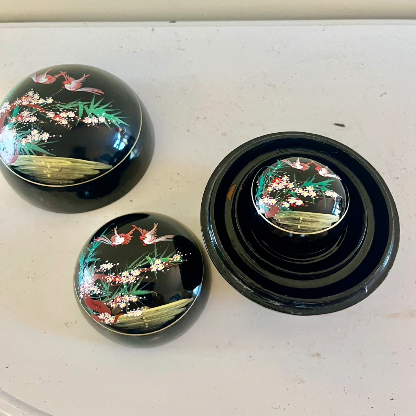 3 hand-painted nesting lacquer boxes in good vintage condition. The set includes three spherical boxes that nest within each other, each adorned with traditional Japanese art, showcasing birds and cherry blossoms.