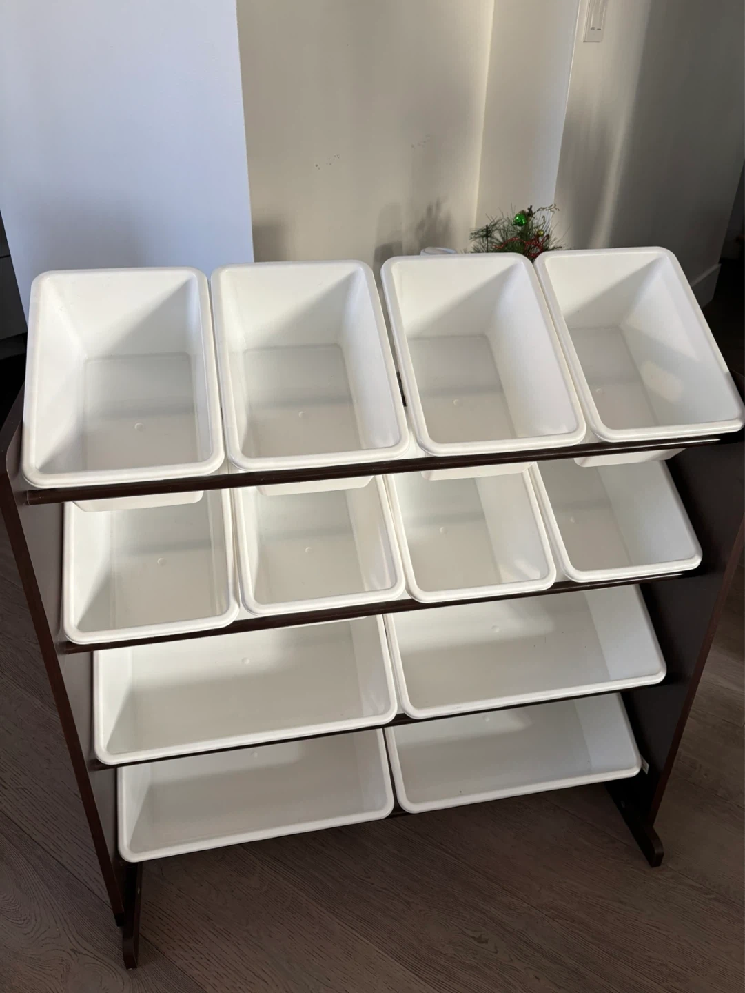 This toy organizer features a dark wood frame and twelve white bins. It's perfect for storing children's toys and books. The bins are removable for easy access and cleaning.