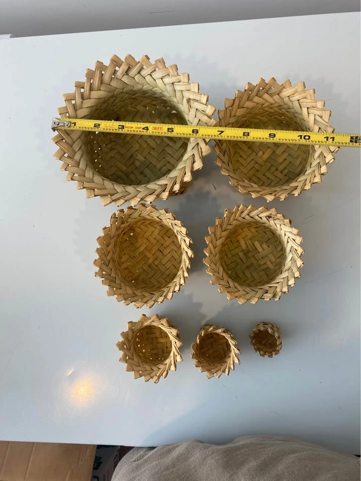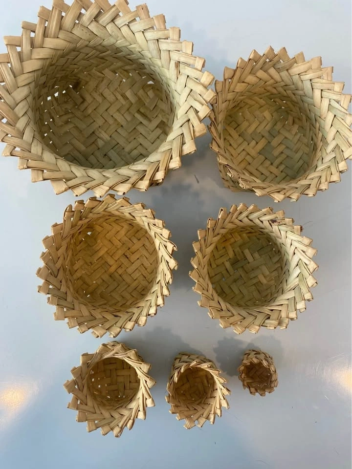 Set of 7 handwoven mini baskets in assorted sizes.