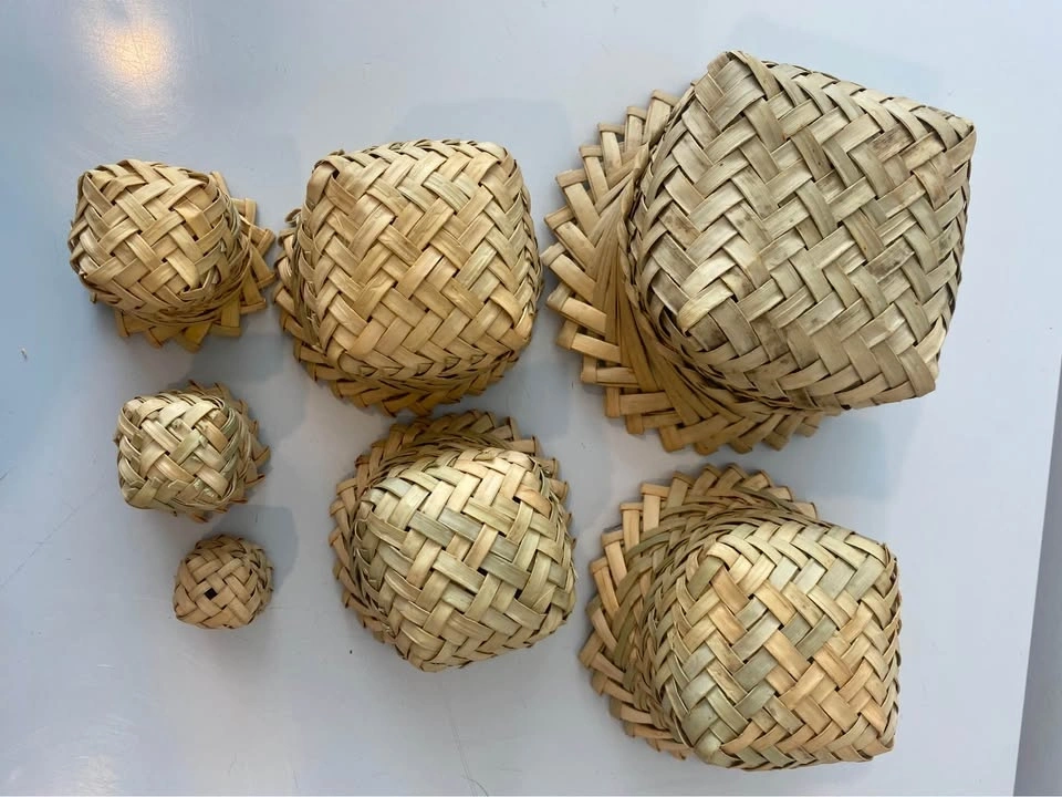 Set of 7 handwoven mini baskets in assorted sizes.