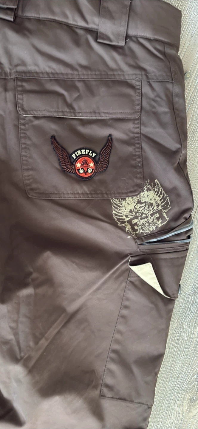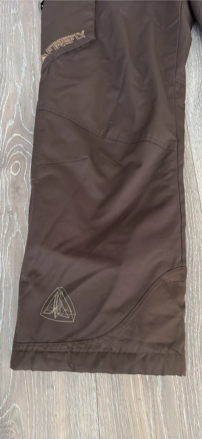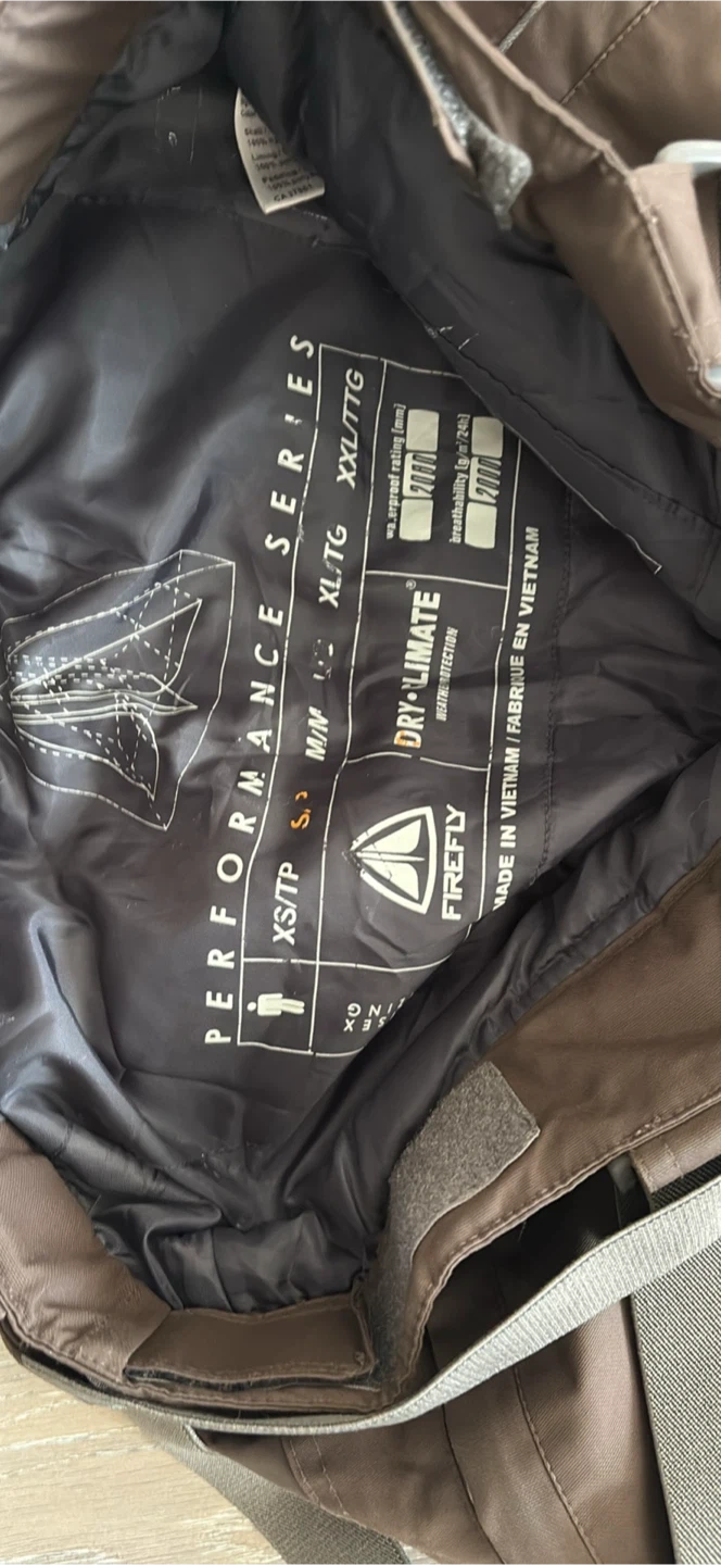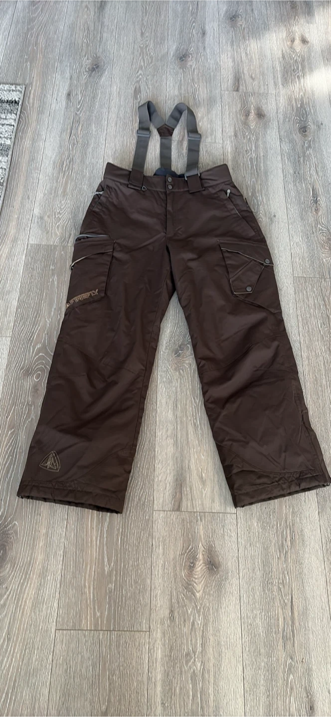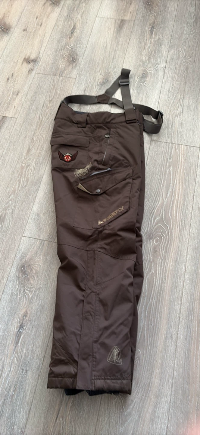 Brown snow pants with adjustable suspenders and multiple zippered pockets. They're made for the outdoors. Great for keeping warm on the slopes! Excellent for go to sky at Grouse Mountain pick up walnut grove Langley at the last pictures is one zipper is broken is Not affect the performens size S