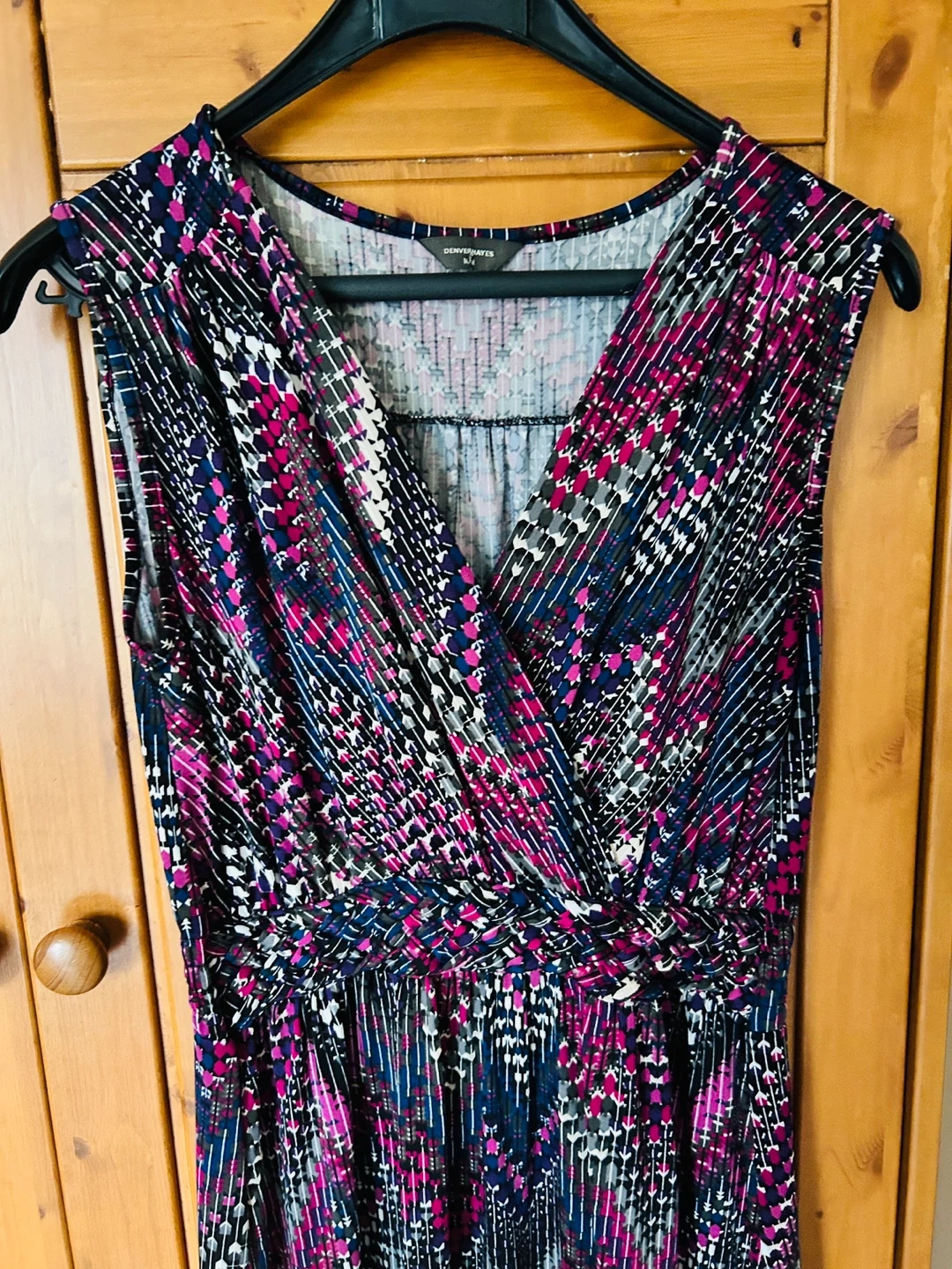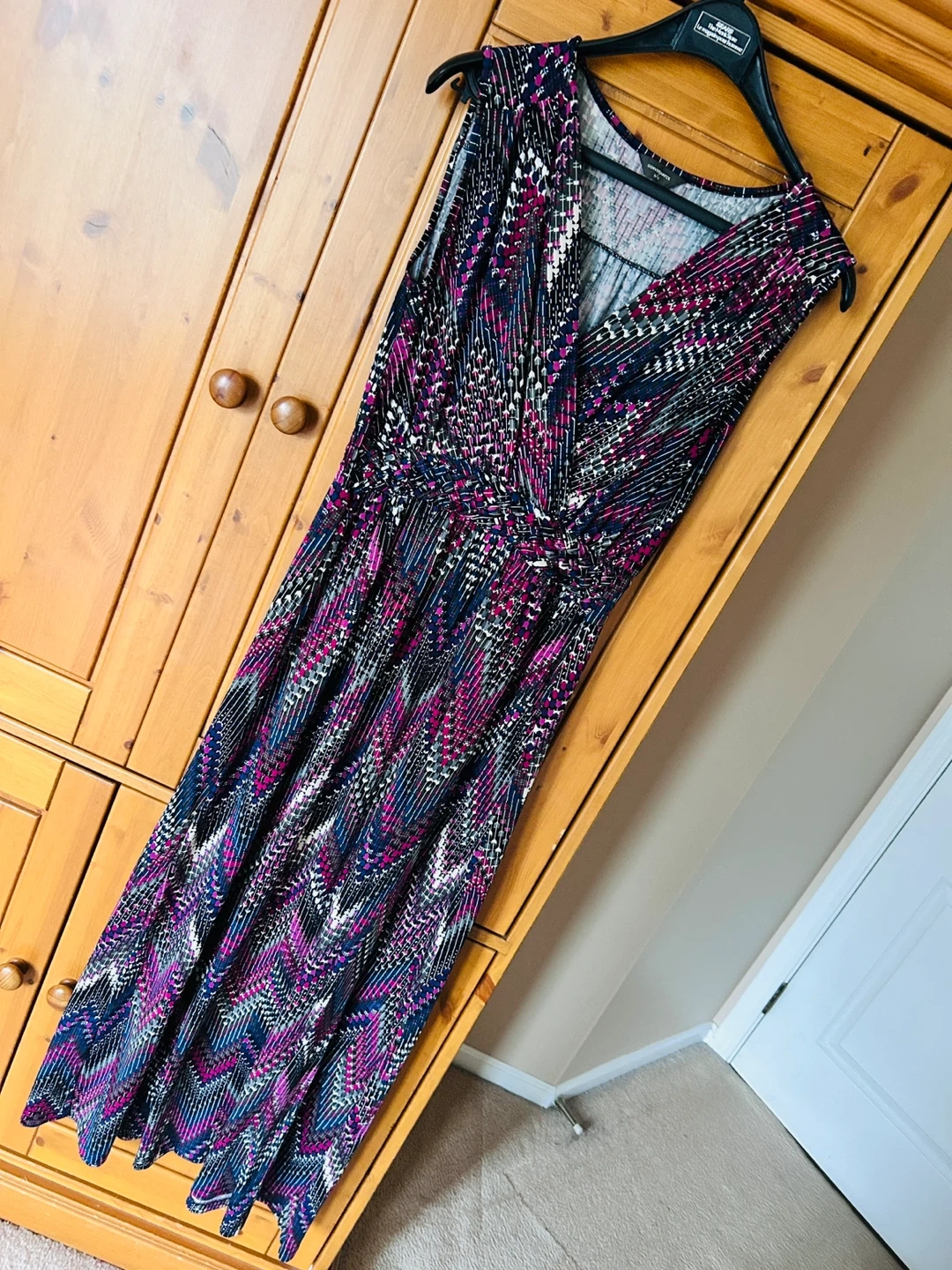 Women's sleeveless maxi dress with a vibrant abstract print. Features a flattering BRAIDED waist design. Perfect for a casual outing or a summer evening. It's made of a comfortable, stretchy fabric. SIZE MEDIUM