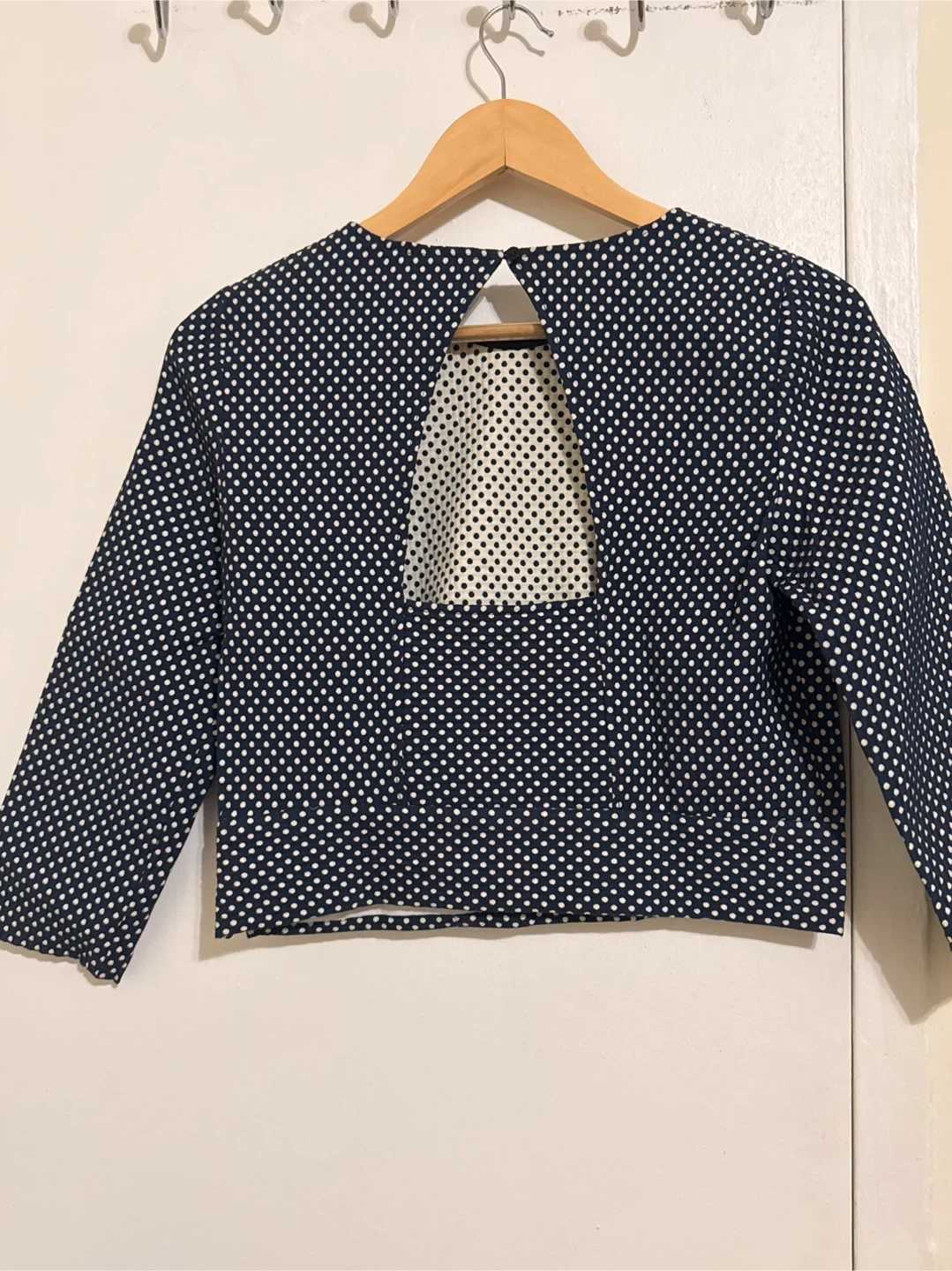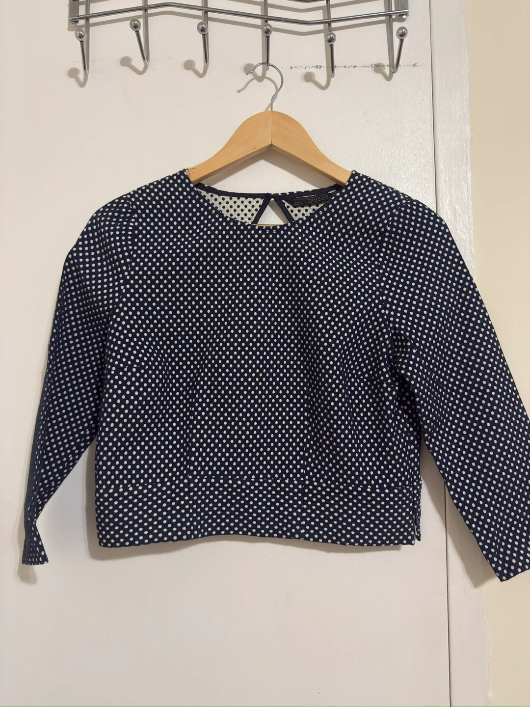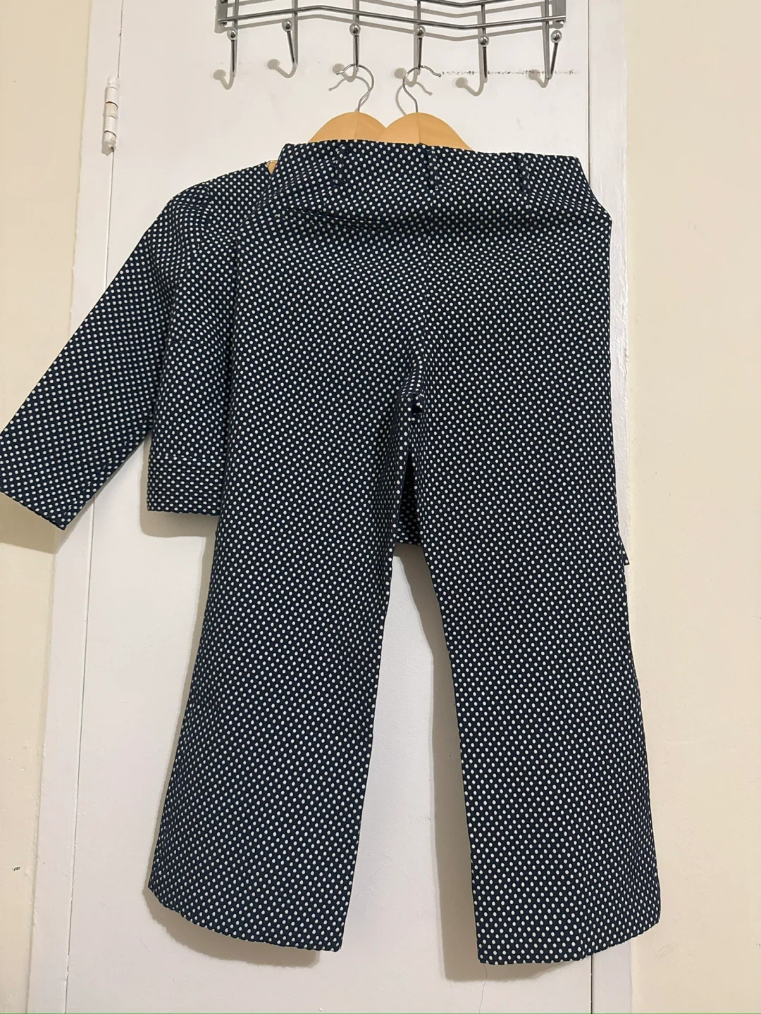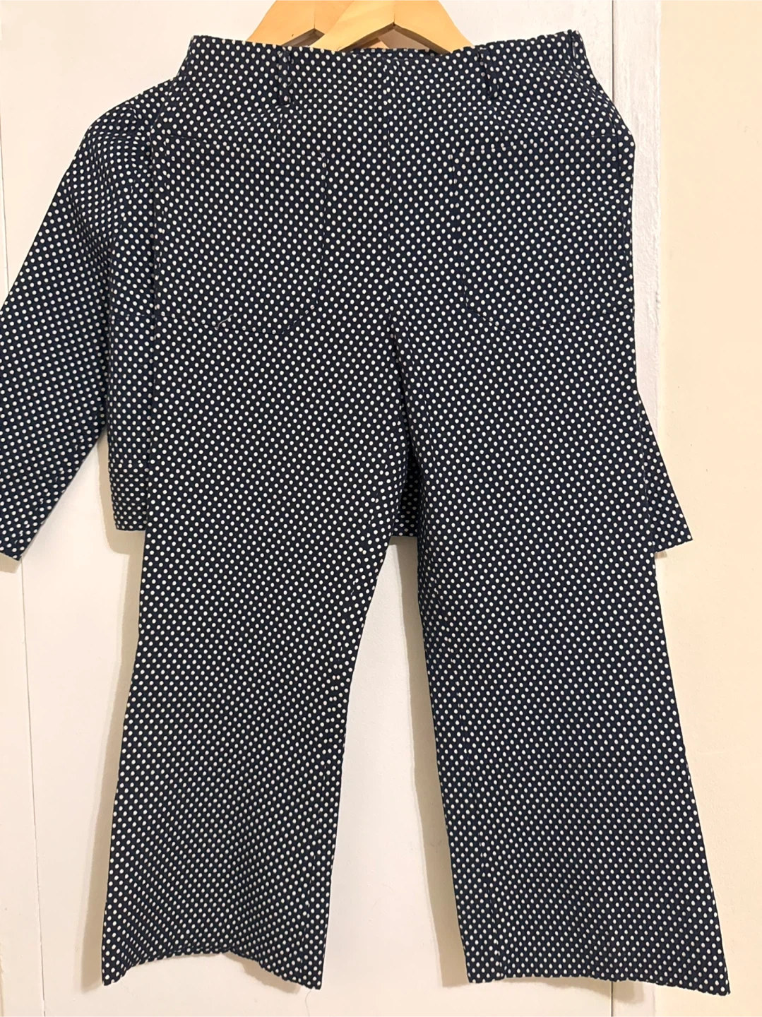 Selling a Zara set that includes a cropped top and pants, both in a navy and white polka dot pattern. This set is perfect for a stylish and coordinated look!