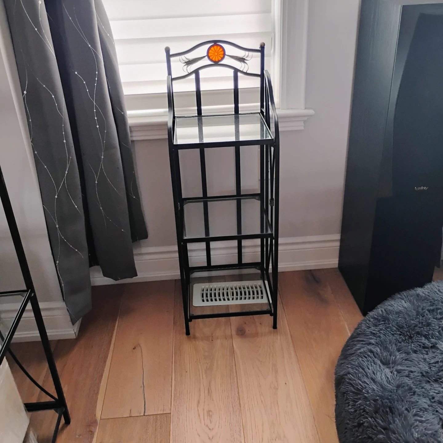 This black metal shelf unit features multiple glass shelves. It has a decorative top with an orange circular accent. Perfect for displaying small items or for extra storage.