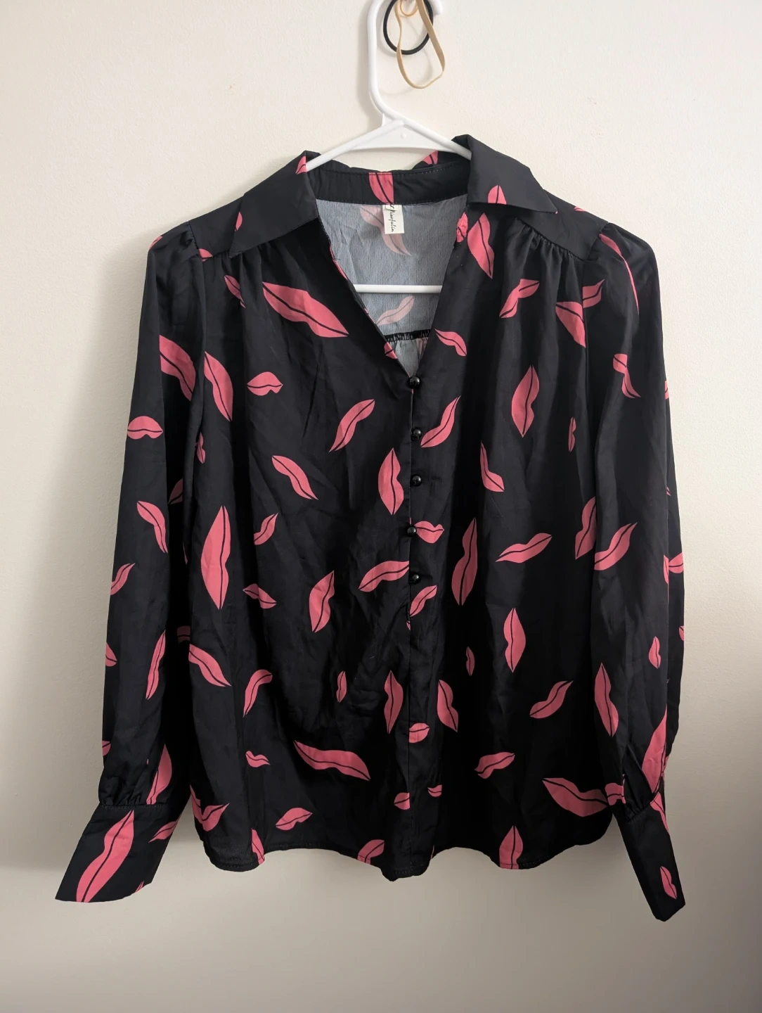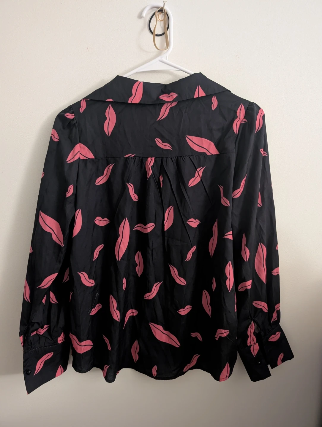 This black blouse features a fun pink lips print all over. It's a button-up style with a collar. Made from a lightweight fabric, it's perfect for adding a playful touch to your outfit!