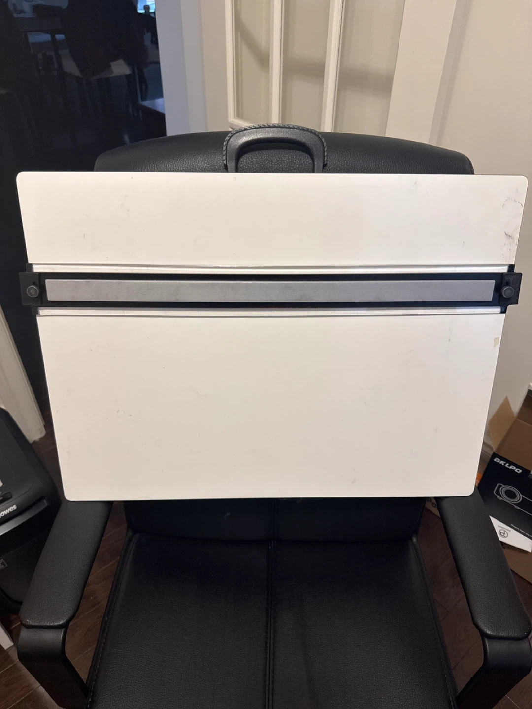 This is a white art drafting board. It's white with black accents and a carrying handle. The board is designed for drawing and drafting. It's useful for artists and designers who work on the go.