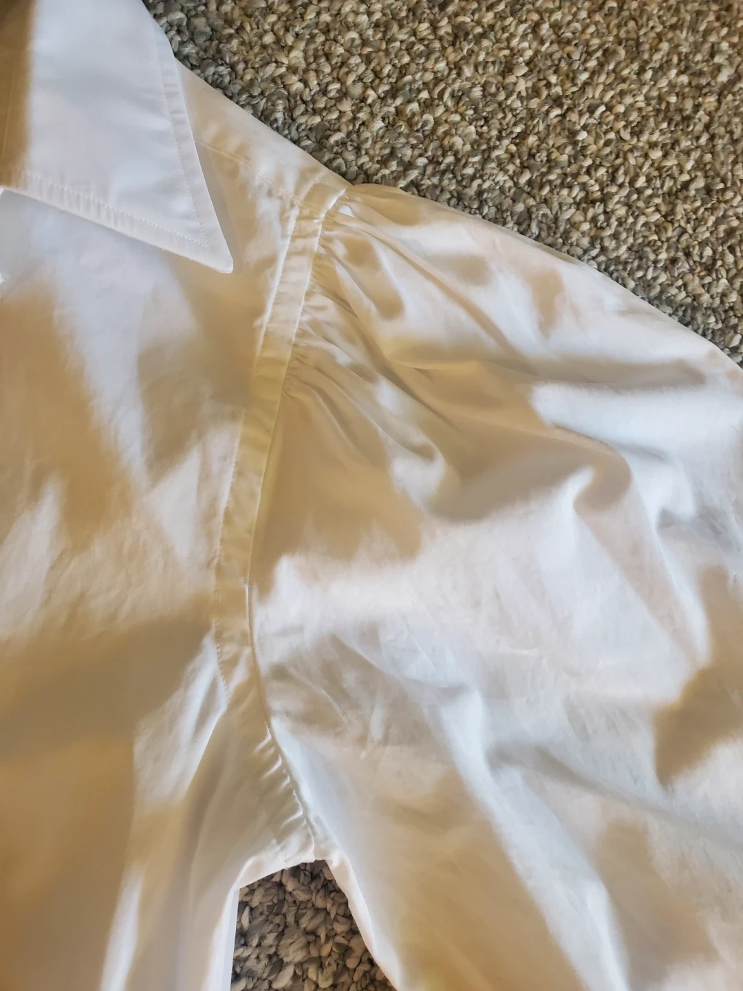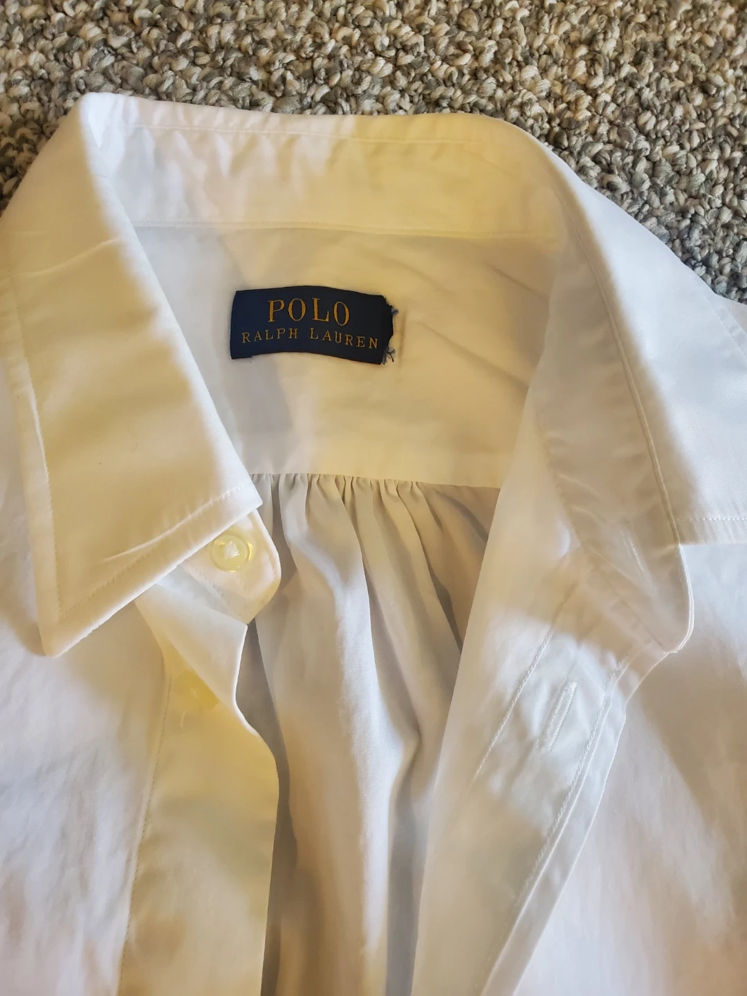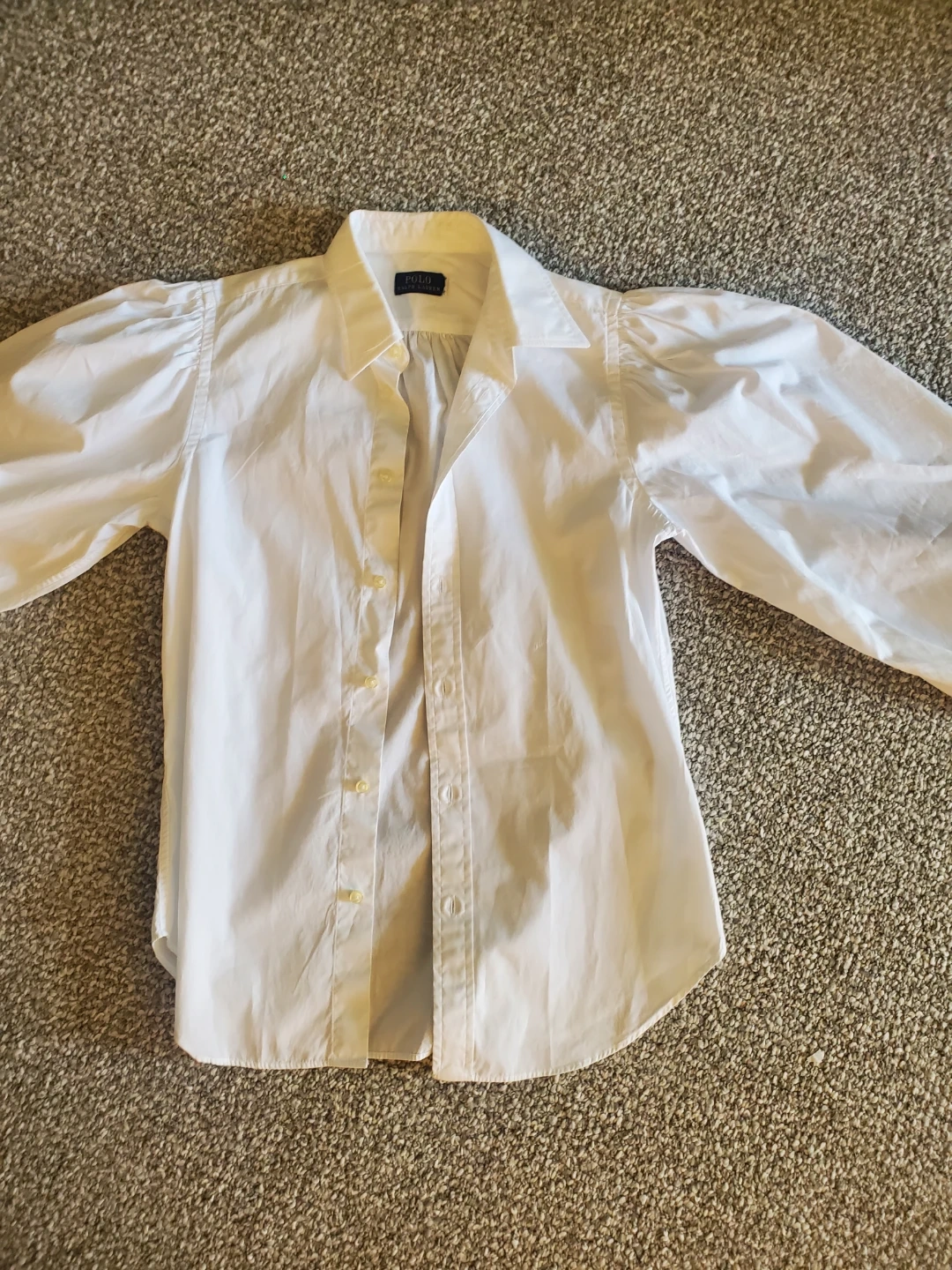 Classic white button-up shirt from Polo Ralph Lauren. Features a collared neckline and button closures. Puffed sleeves add a stylish detail. Made from a comfortable fabric. Size small would fit women size 2-6. Pick up in Poco near Shaughnessy and Lougheed