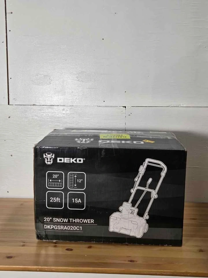 Brand new DEKOPRO 20 inch electric snow blower. Features a 15A motor for efficient snow clearing, a 20-inch wide path, and a 25ft throw distance. Includes dual LED lights for visibility and a compact design for easy storage. Ready for pickup today.