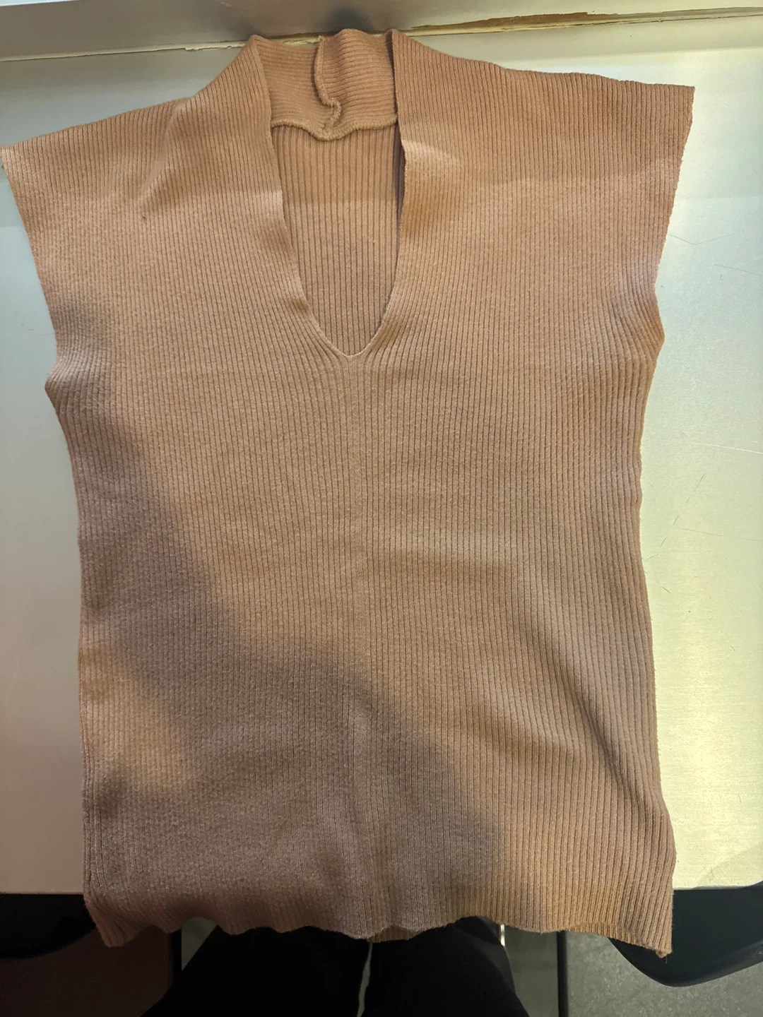 This is a ribbed knit sleeveless top. It's a pullover style with a deep V-neck and a mock neck collar. The material is stretchy and comfortable.