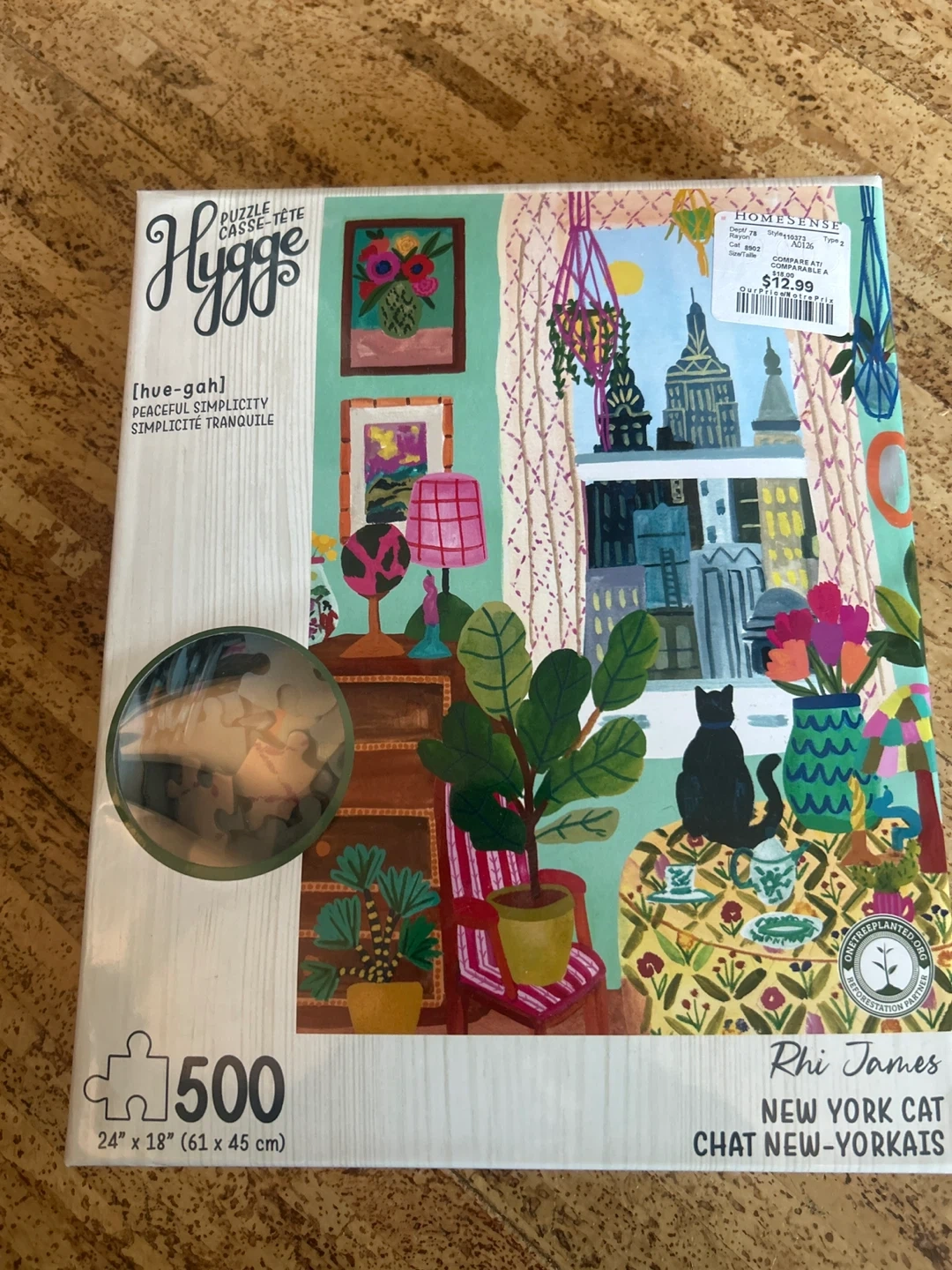 This Hygge puzzle features the "New York Cat" design by Rhi James. It has 500 pieces and measures 24" x 18" (61 x 45 cm). It's great for puzzlers who enjoy detailed, colourful scenes.