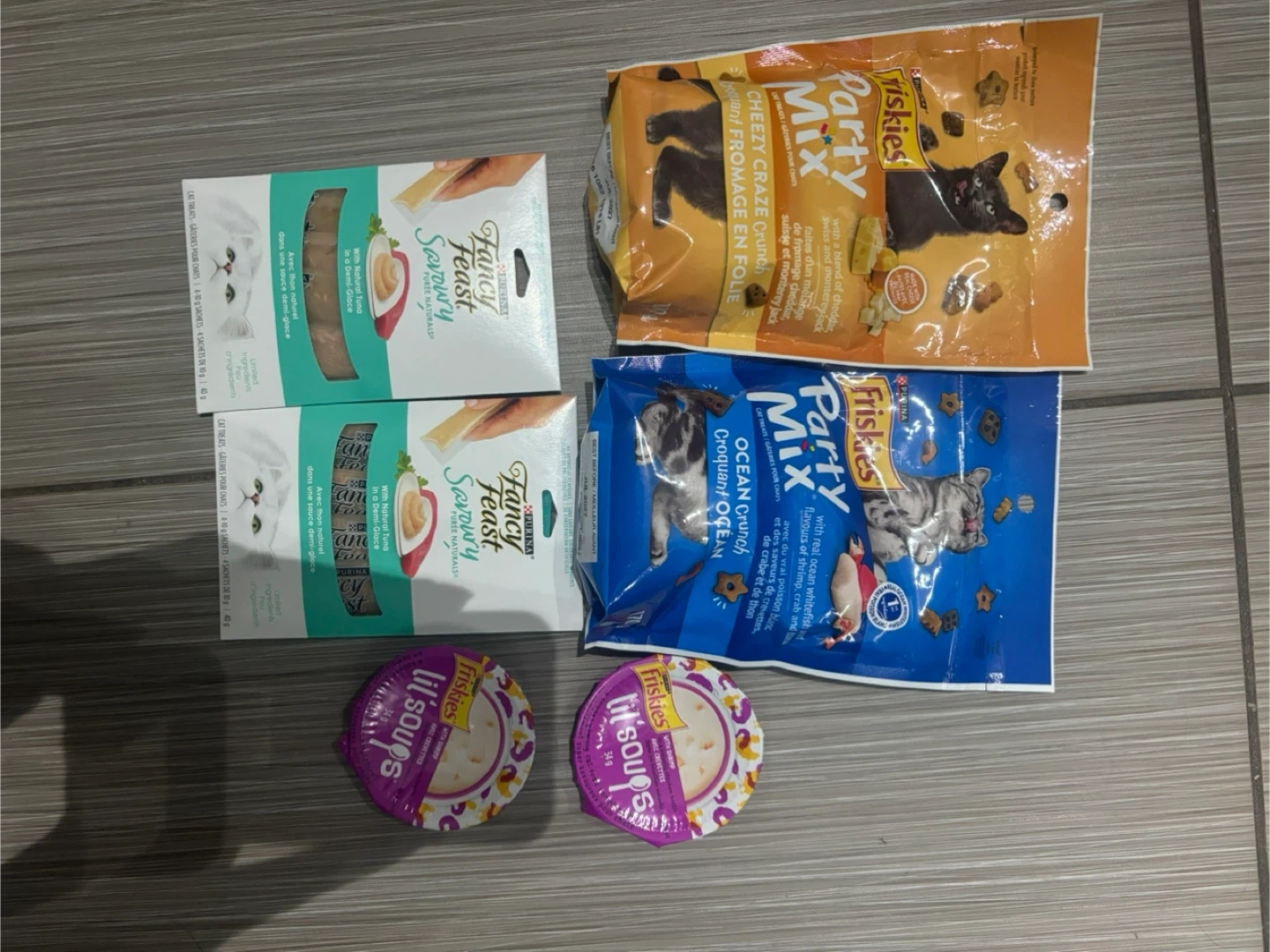 This pack includes Friskies Party Mix treats in Cheezy Craze Crunch and Ocean Crunch flavours. It also features Fancy Feast Savoury Purée Naturals with Tuna in a Demi-Glace and Friskies Lil' Soups with Shrimp. Many of these items have a best before date of 2027.