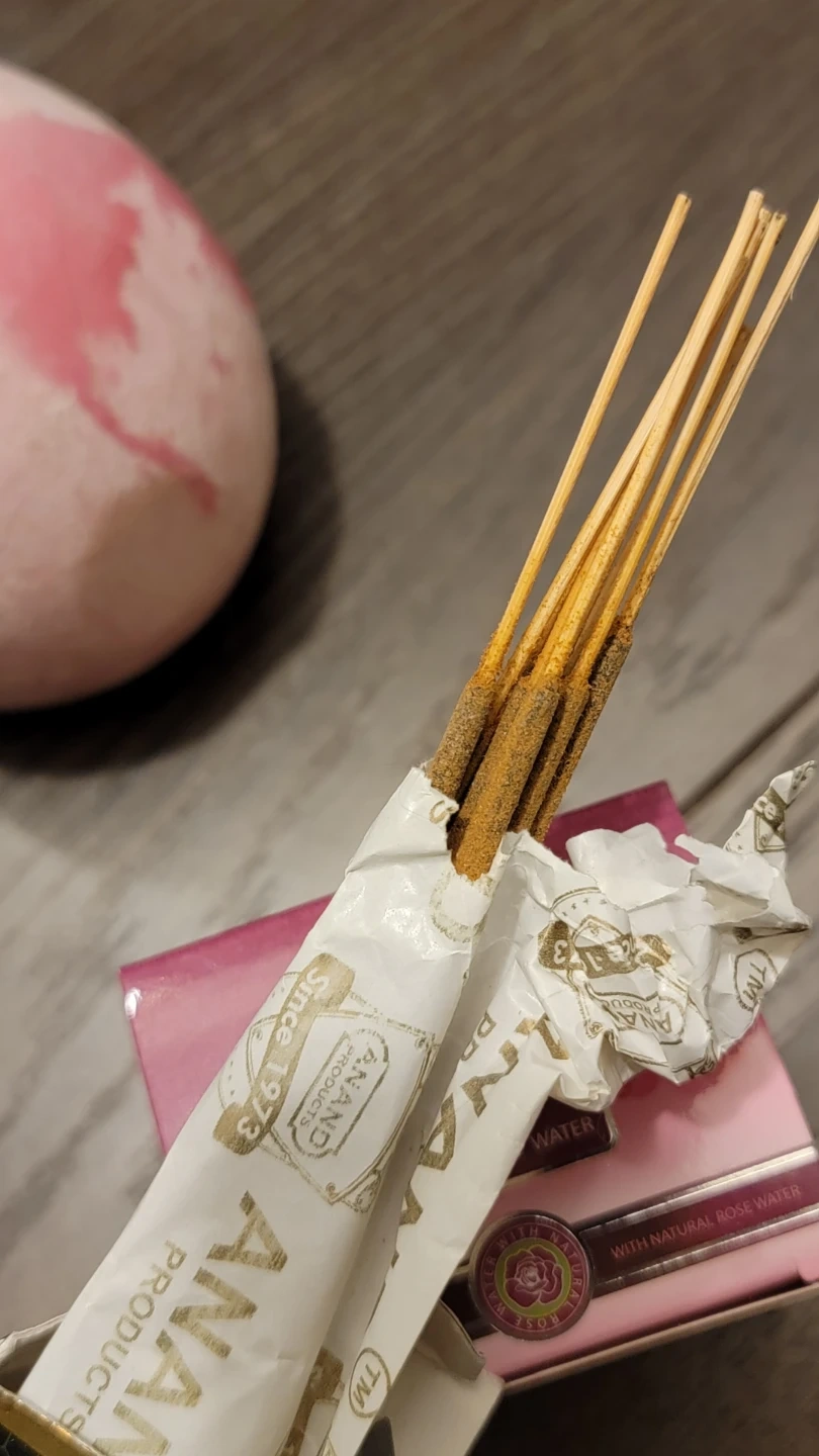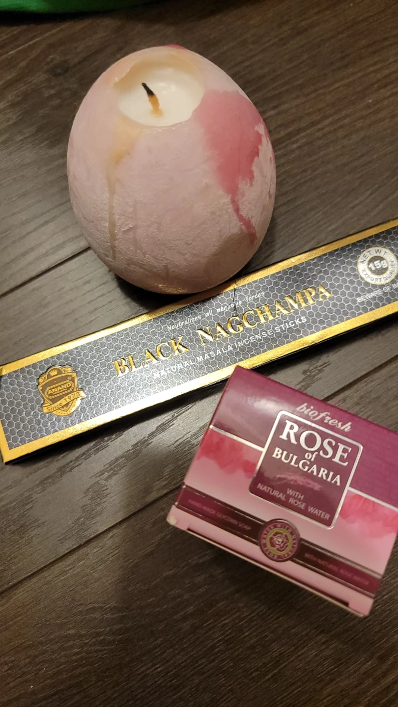This pack contains Anand Black Nag Champa natural masala incense sticks. Brand new Rose of Bulgaria rose soap with rose water & pink candle for your pampering needs ๐