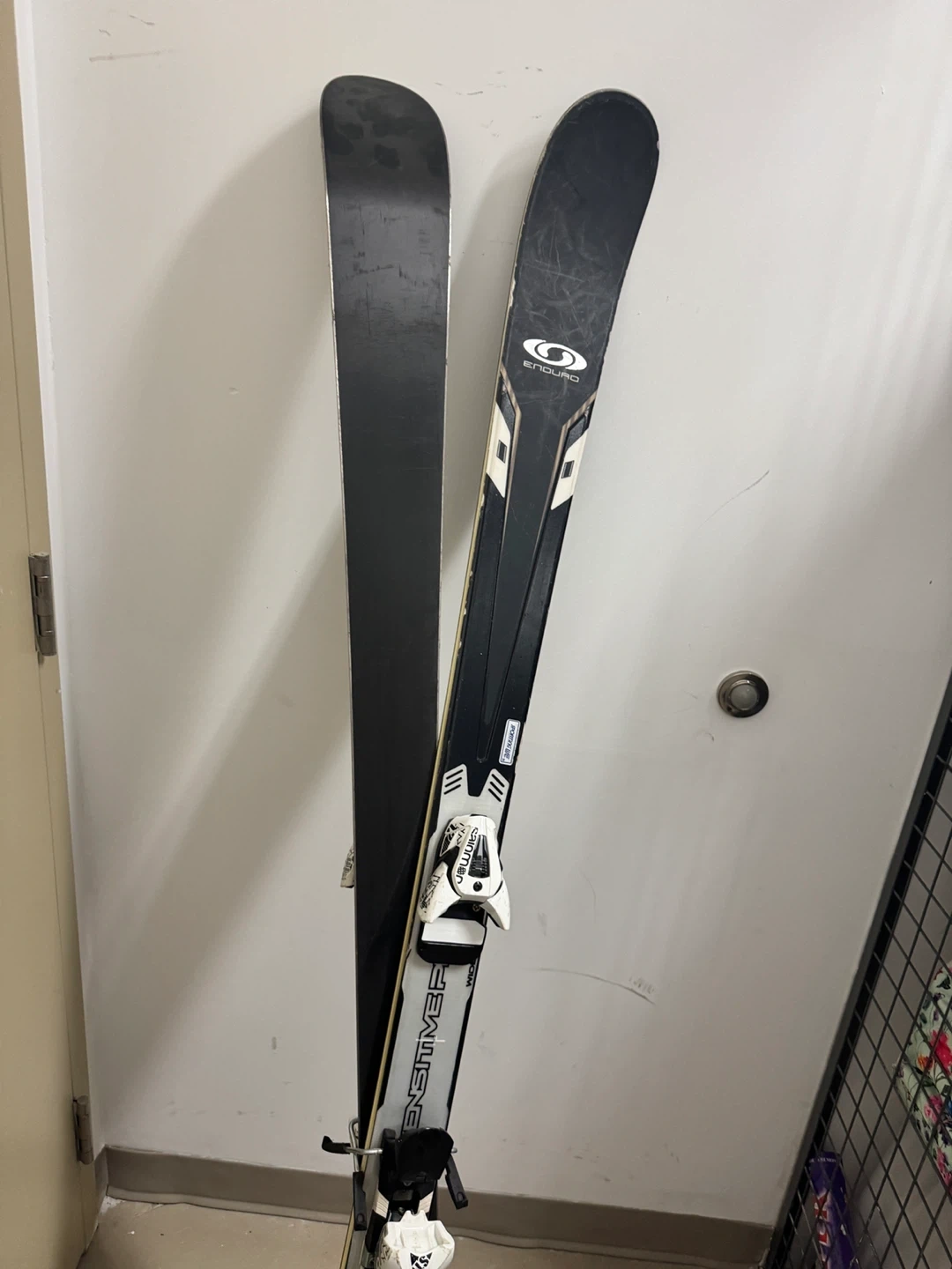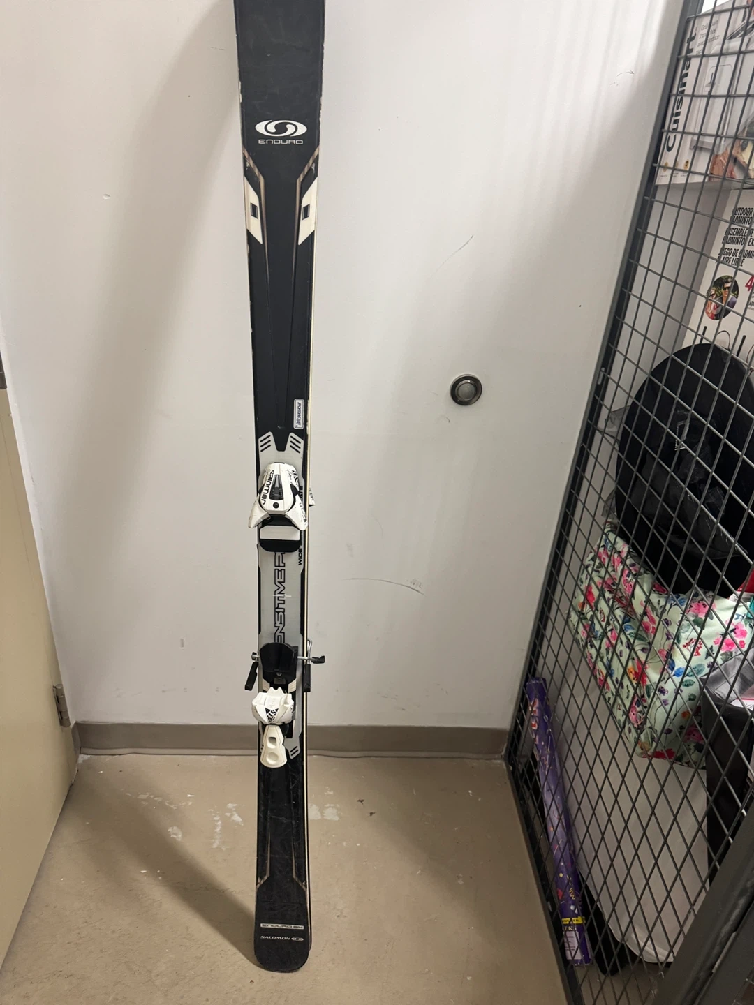 Salomon Enduro Wide skis are ready for the slopes. They feature Salomon bindings for a secure fit. These skis are designed for performance on varied terrain.