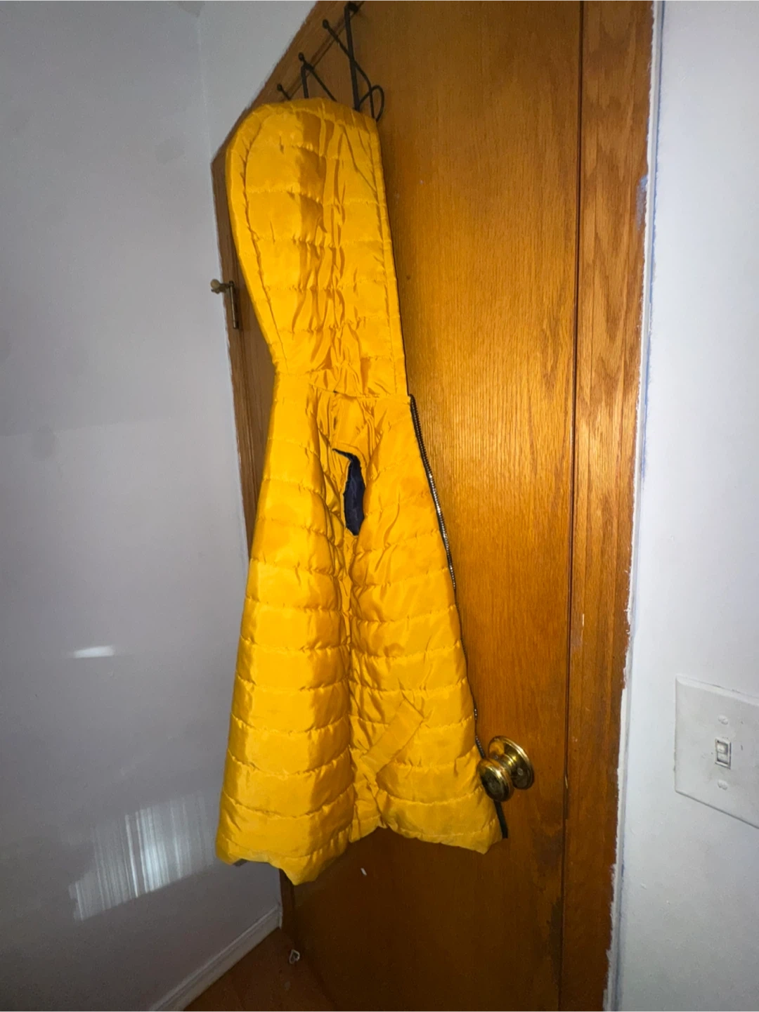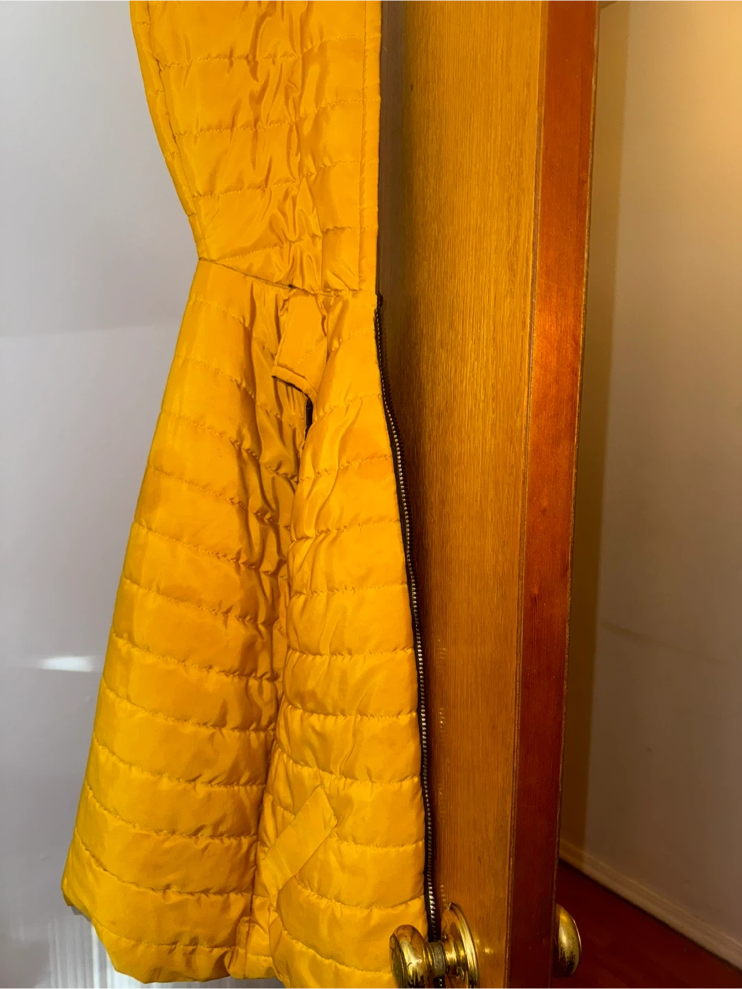 This is a yellow puffer vest with a navy blue lining. It's sleeveless and features a zipper closure. The vest is quilted for warmth.