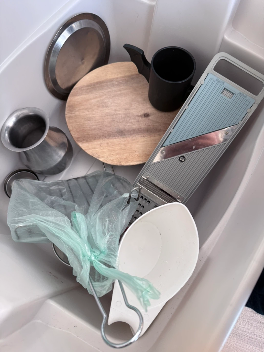 A collection of kitchen tools including a mandoline slicer, masher, cutting board, and measuring cups. These items are handy for food preparation. Useful for anyone who does a lot of cooking or baking!