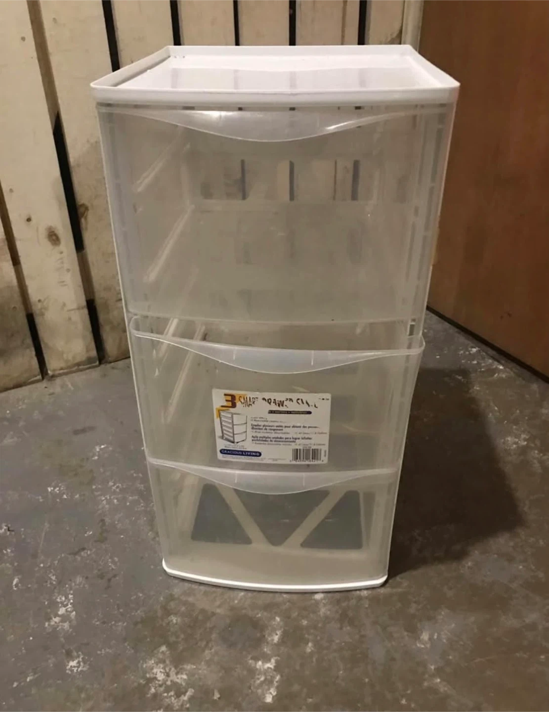 This is a clear plastic 3 drawer storage unit. It's great for organizing small items like craft supplies or office essentials. The drawers are easy to pull out. Doors don’t close very well