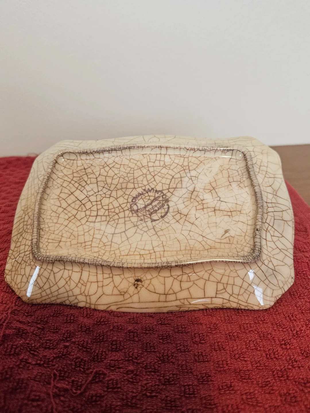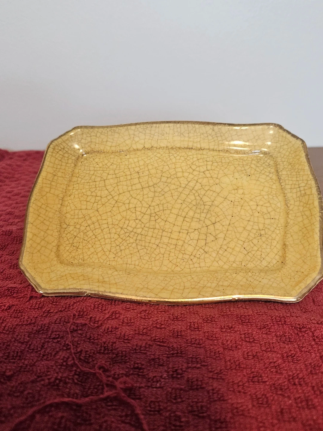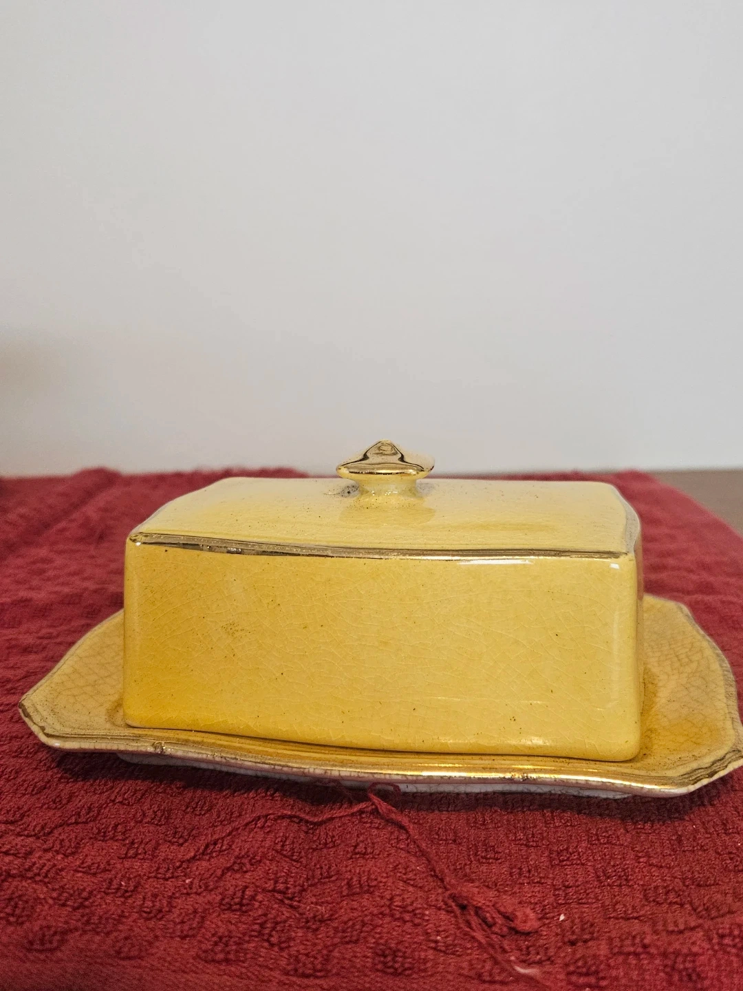 Royal Winton mottled yellow butter Dish. No chips or cracks but heavily crazed with staining to tray underside.