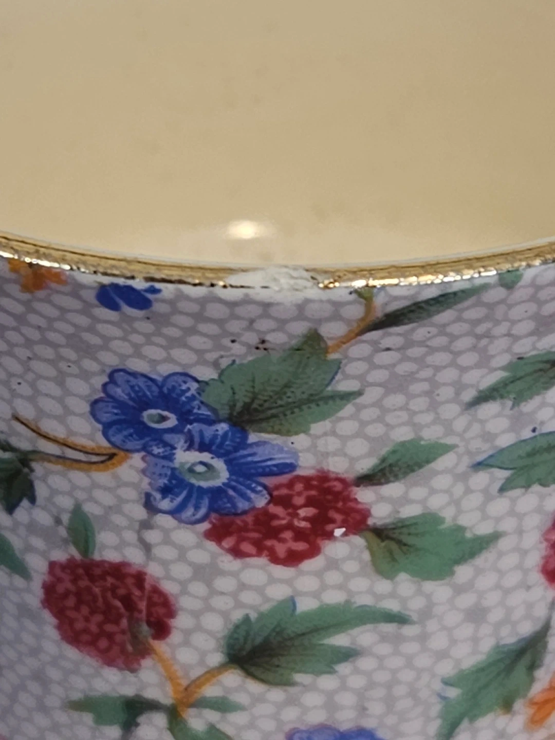 Royal Winton Old Cottage Chintz teacup. It's made of porcelain and features a detailed floral pattern with gold trim. Small chip to rim.