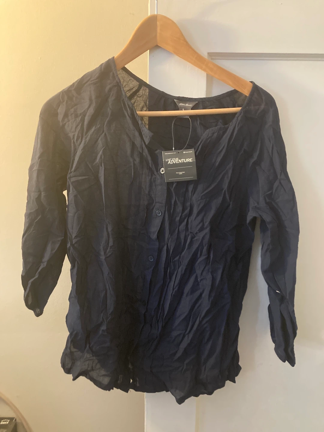 This navy blue button-up shirt is from Eddie Bauer. It features a relaxed fit and three-quarter length sleeves. The lightweight fabric makes it comfortable for everyday wear. Size small