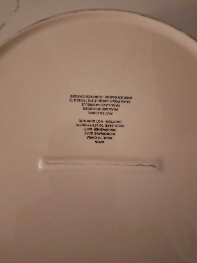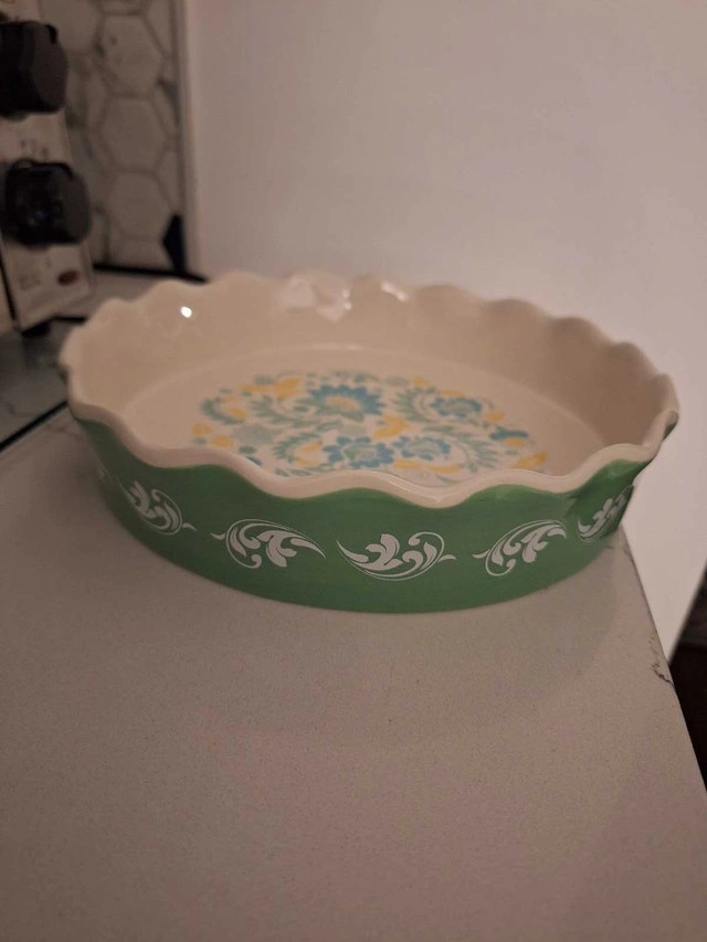 Ceramic pie dish, 8" round with a beautiful print on the bottom and a decorative outer side. Microwave, oven, and dishwasher safe. Very good condition. Asking $4 cash. Pickup in south Ajax.