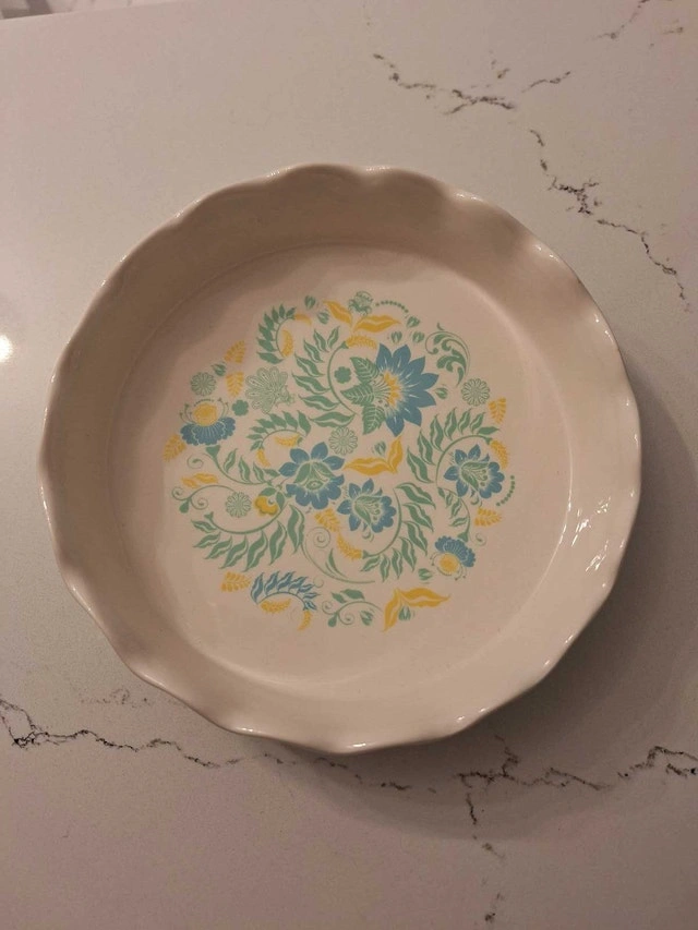 Ceramic pie dish, 8" round with a beautiful print on the bottom and a decorative outer side. Microwave, oven, and dishwasher safe. Very good condition. Asking $4 cash. Pickup in south Ajax.