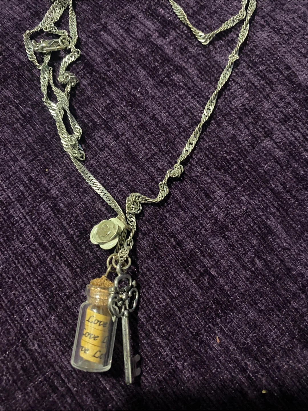 This necklace features a small glass bottle with a rolled-up note inside that says 'Love'. It's attached to a silver-tone chain with a decorative key charm and a small flower accent. The chain appears to be a twisted rope style.