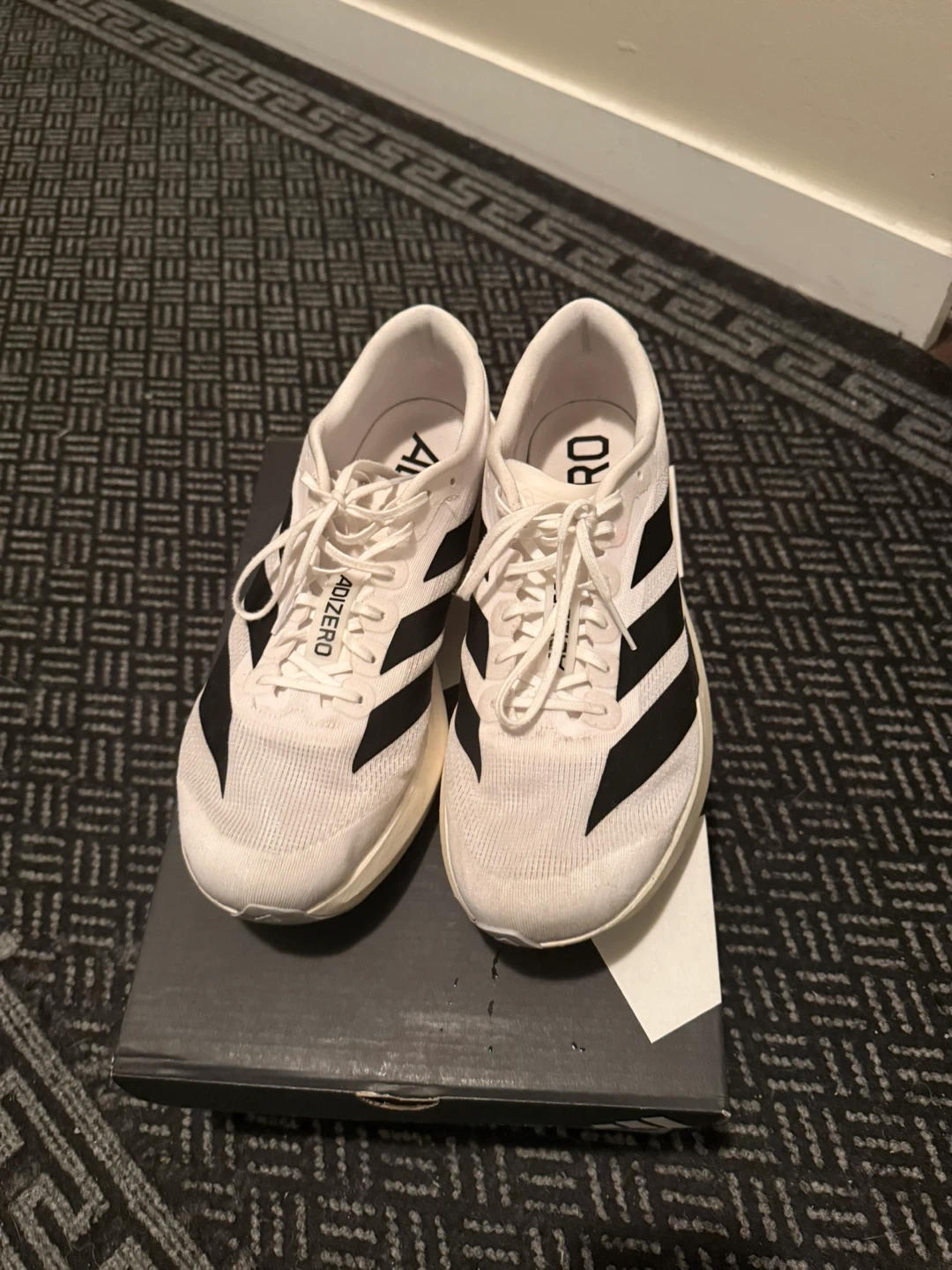 Selling a pair of Adidas Adizero running shoes! They come with the original box. Barely use wrong size for me. Great for anyone looking for a lightweight and fast running shoe