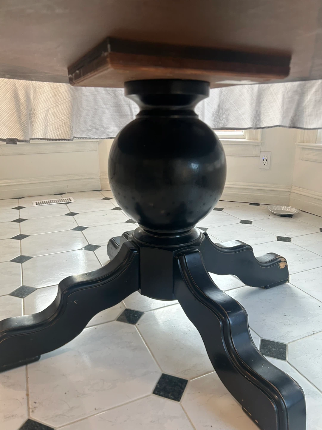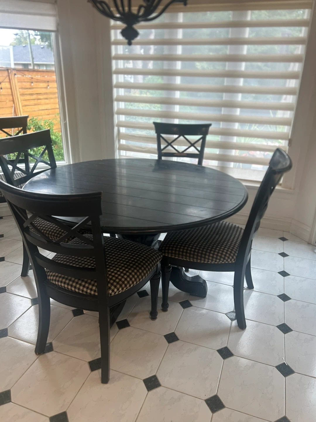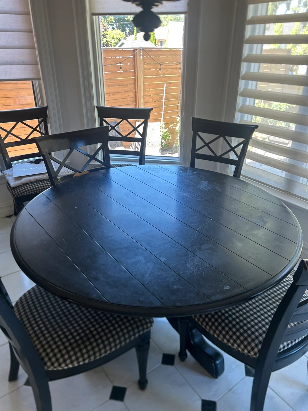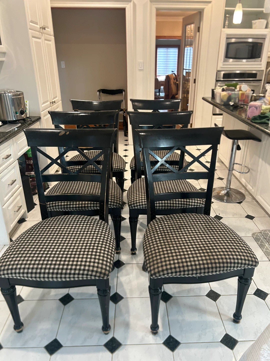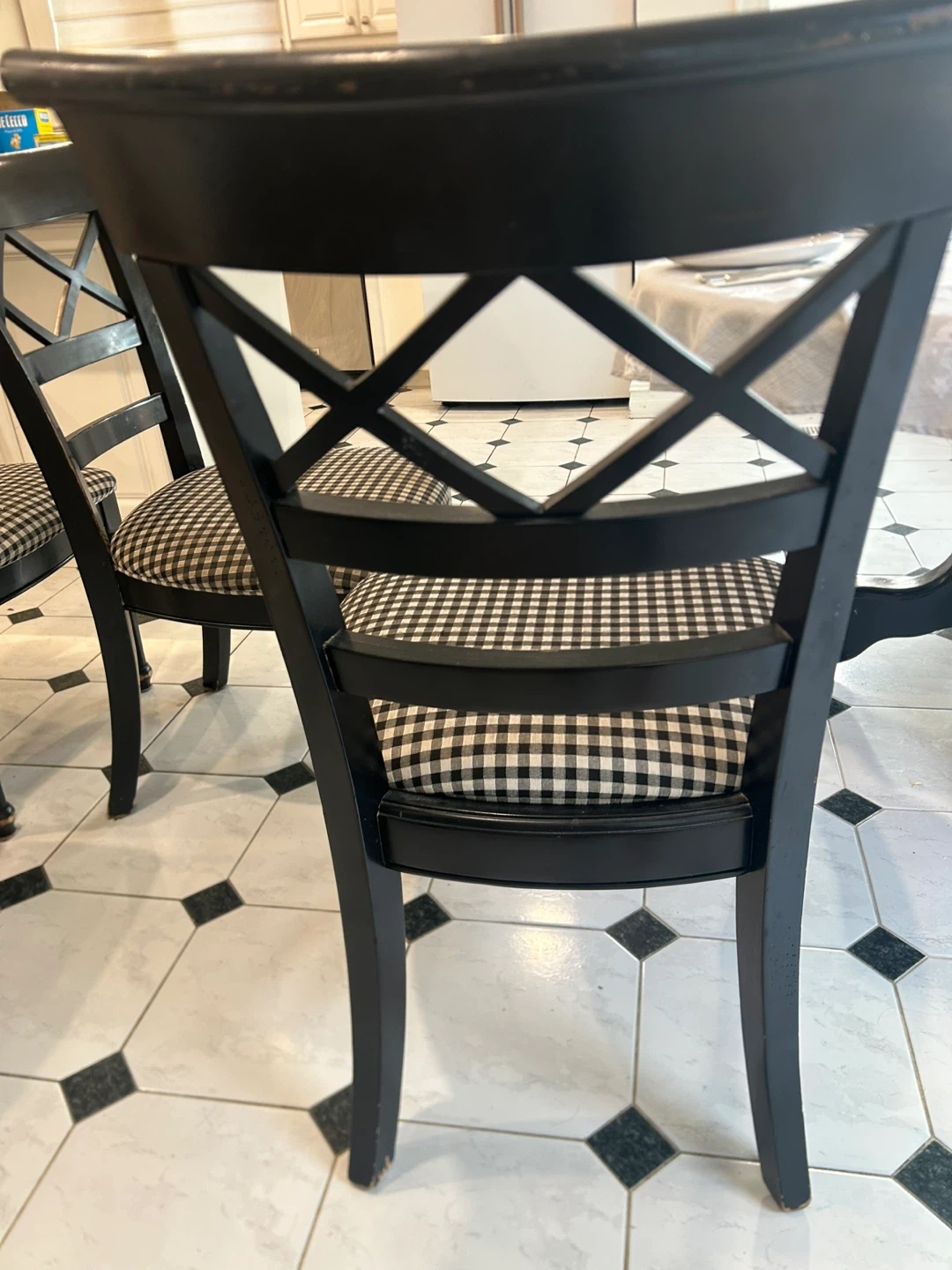Selling a solid wood dining table with six chairs made by high end furniture manufacturer Stanley Furniture. The chairs are black with a black and white checkered pattern on the seat. The table and chairs have some wear and tear, but are still in good condition.