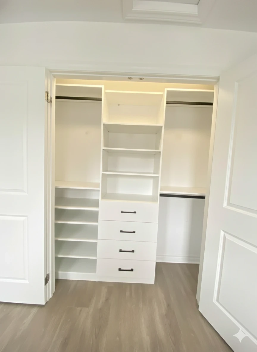 Custom closet organizer with shelves and drawers. Great for maximizing your closet space and keeping everything organized