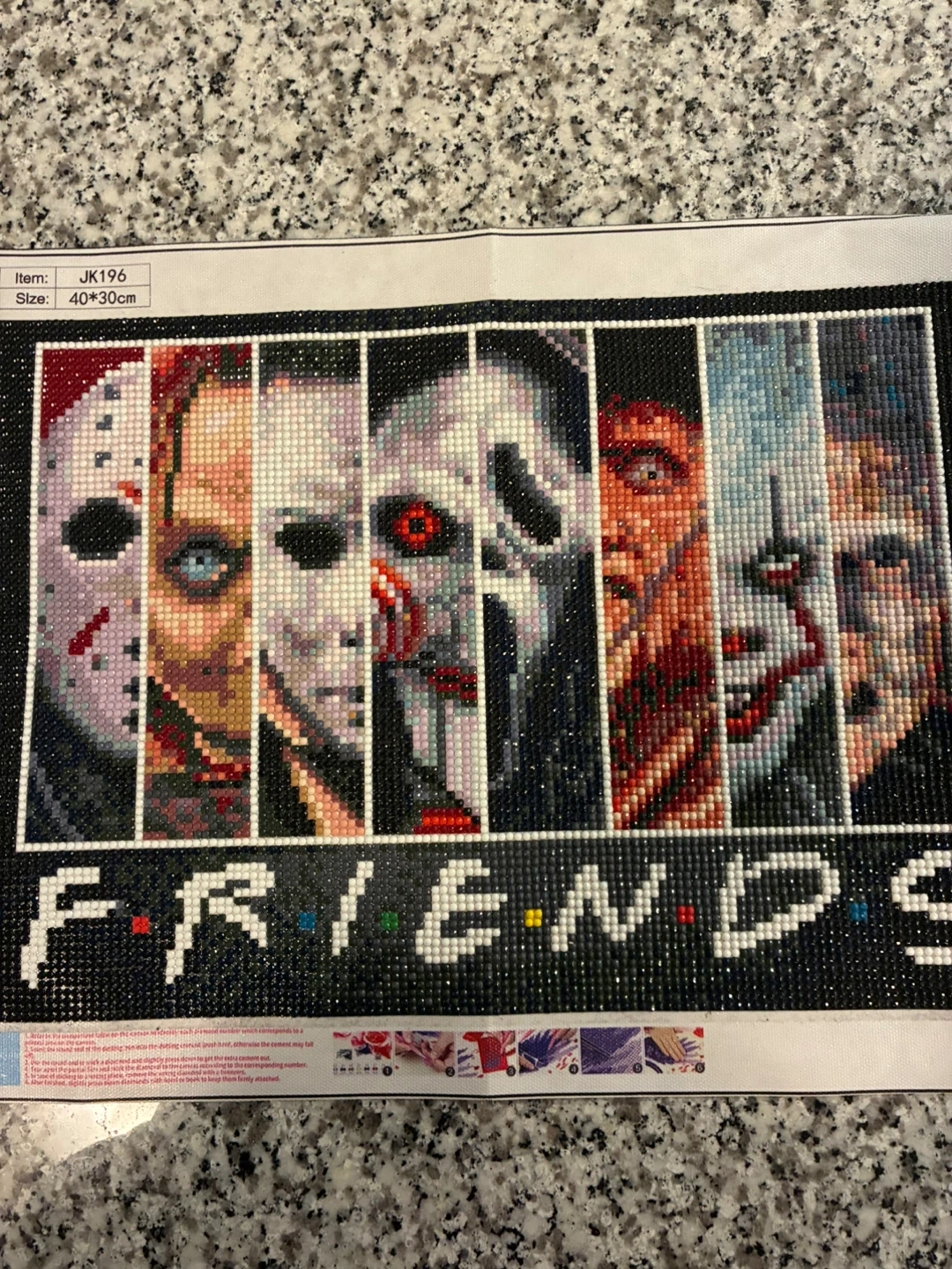 Complete Diamond painting featuring horror icons in a Friends theme. Size is 40*30cm. This unfinished craft kit is perfect for horror fans who enjoy diamond art.