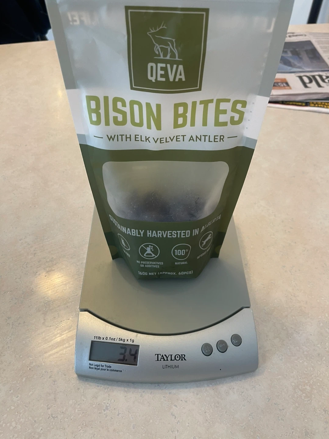Qeva bison bites- 96.38 grams left out of 160 gram bag. Valued at $34
