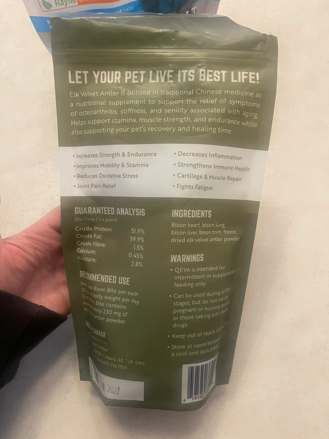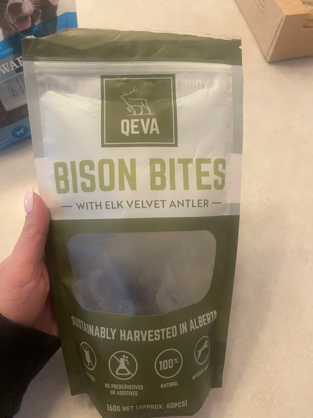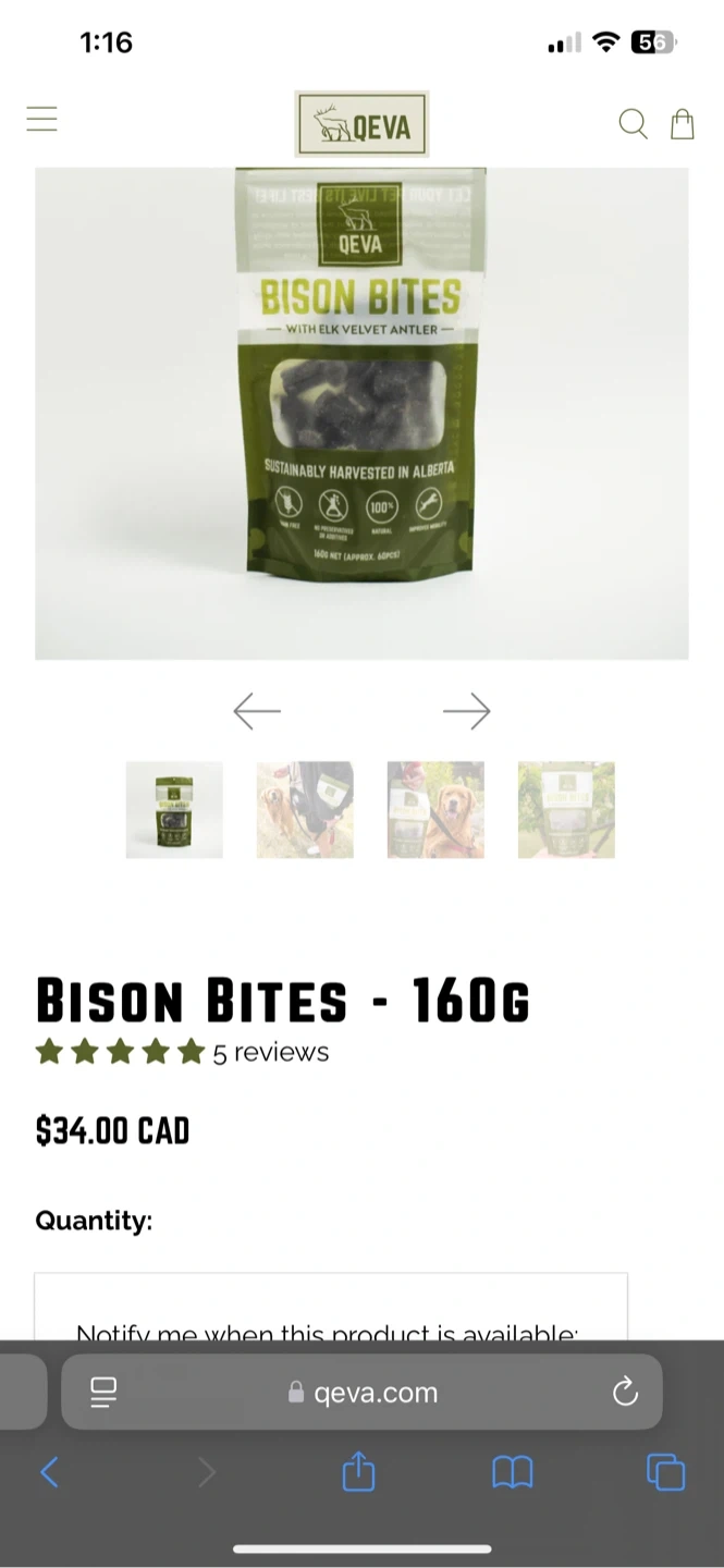 Qeva bison bites- 96.38 grams left out of 160 gram bag. Valued at $34