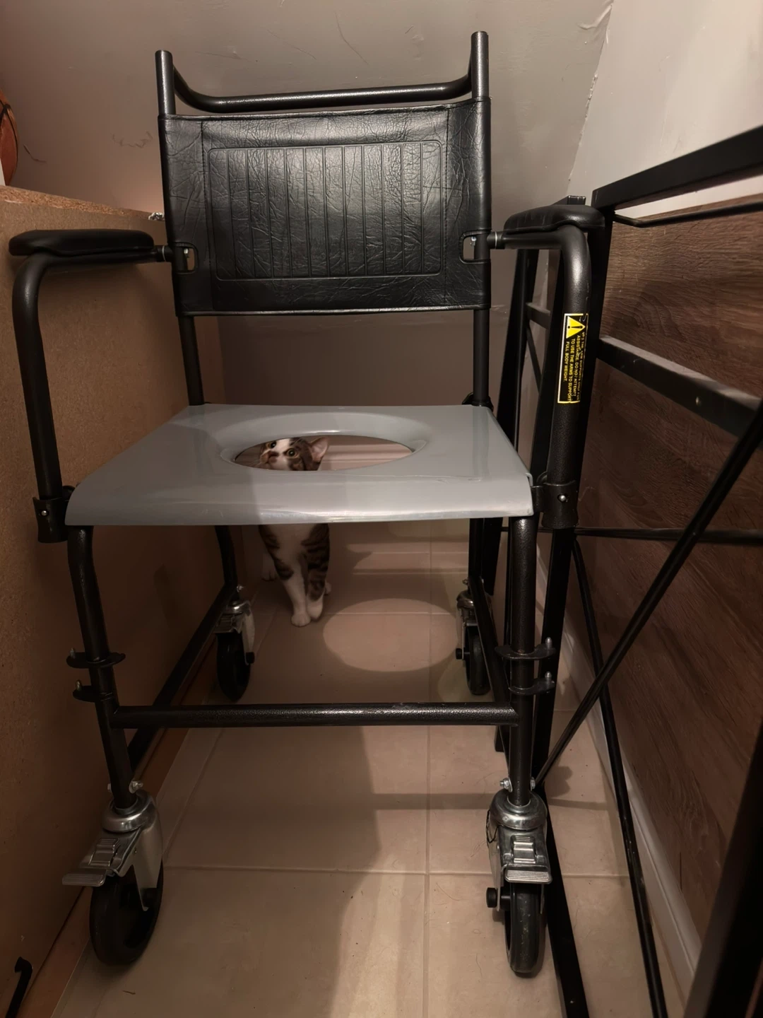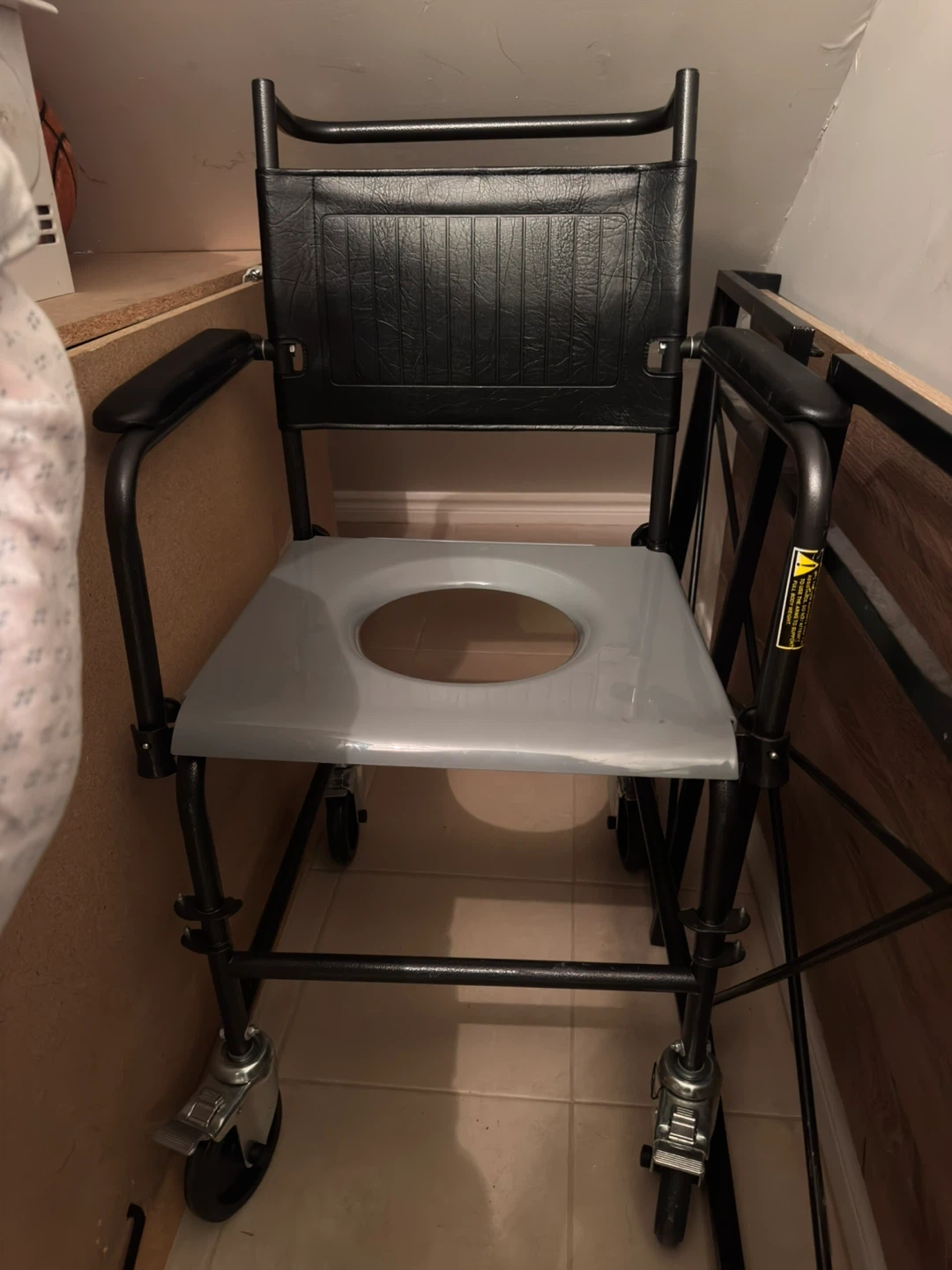 This rolling commode chair features a durable metal frame and a padded seat and backrest. It has four wheels for easy mobility. The seat has a cutout for toilet use.